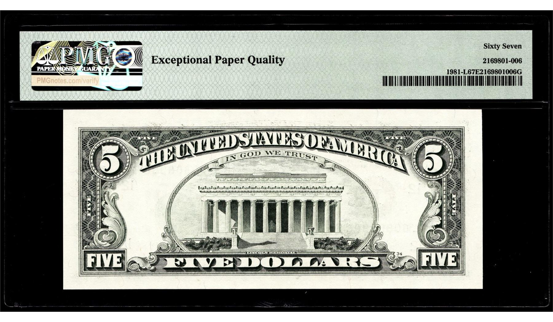 One 1988A $5 Federal Reserve Note San Francisco Fr.1981-L PMG Superb Gem Unc 67EPQ. PMG Certified.