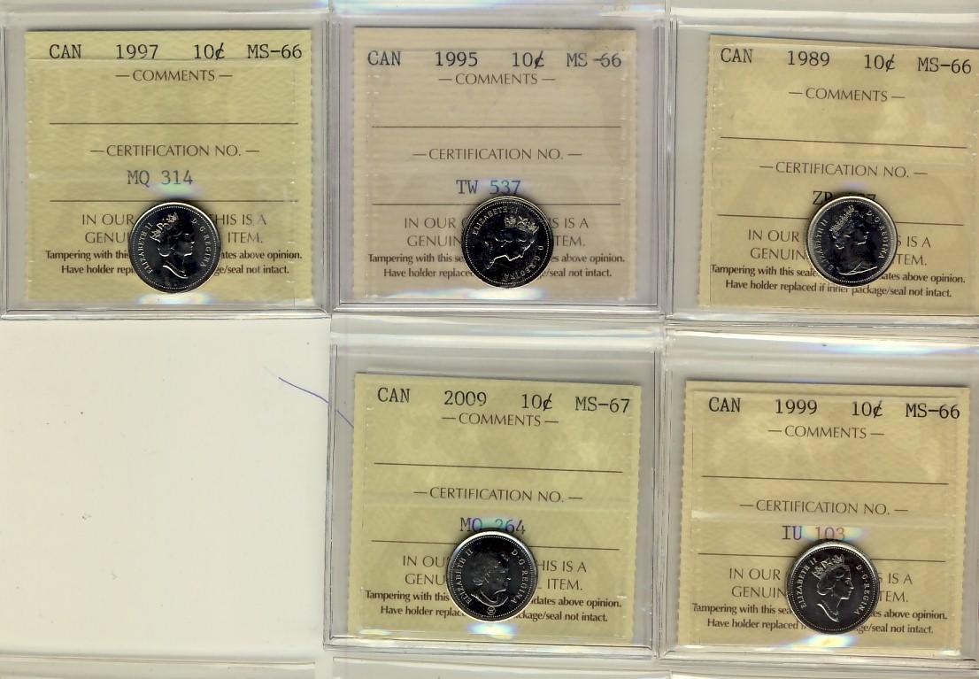 1989 10¢ 1995, 1997, 1999 10¢, MS66 & 2009 MS67. Lot of 5 coins.