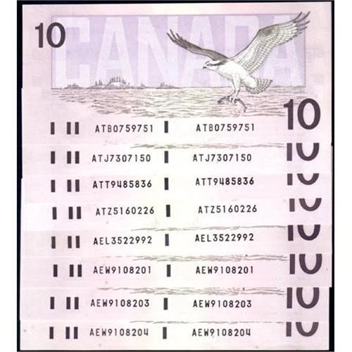 1989 Ten Dollars, Thiessen-Crow, BC-57a, eight notes, Prefixes: ATB, ATJ, ATT, ATZ, AEL and three AEW, all AU and Uncirculated