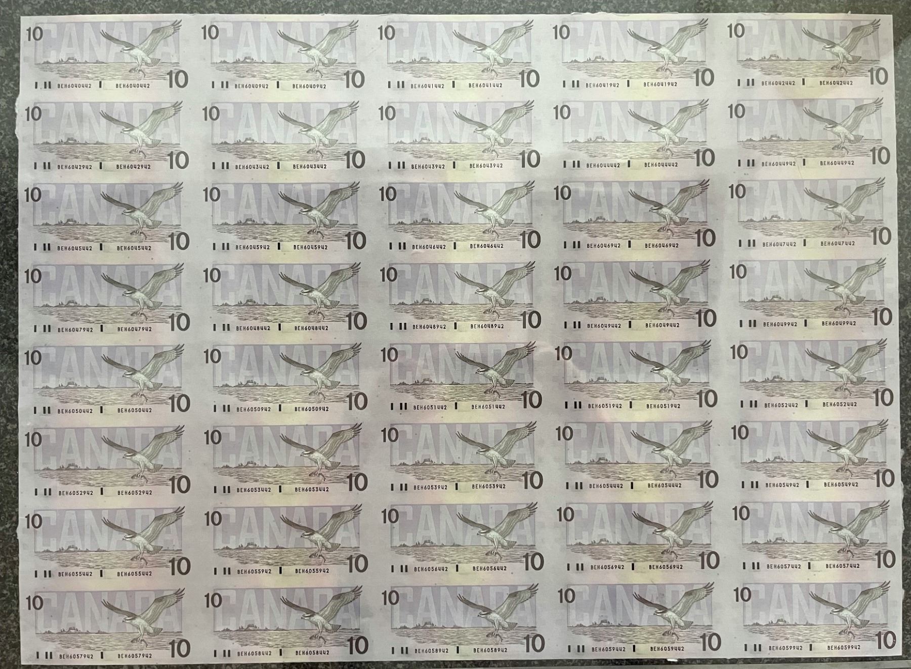 1989 $10 BC-57c #BEH Uncut Sheet of 40 Notes. A nice typical AU/UNC example with ligt handling and some remnance paper on rims.