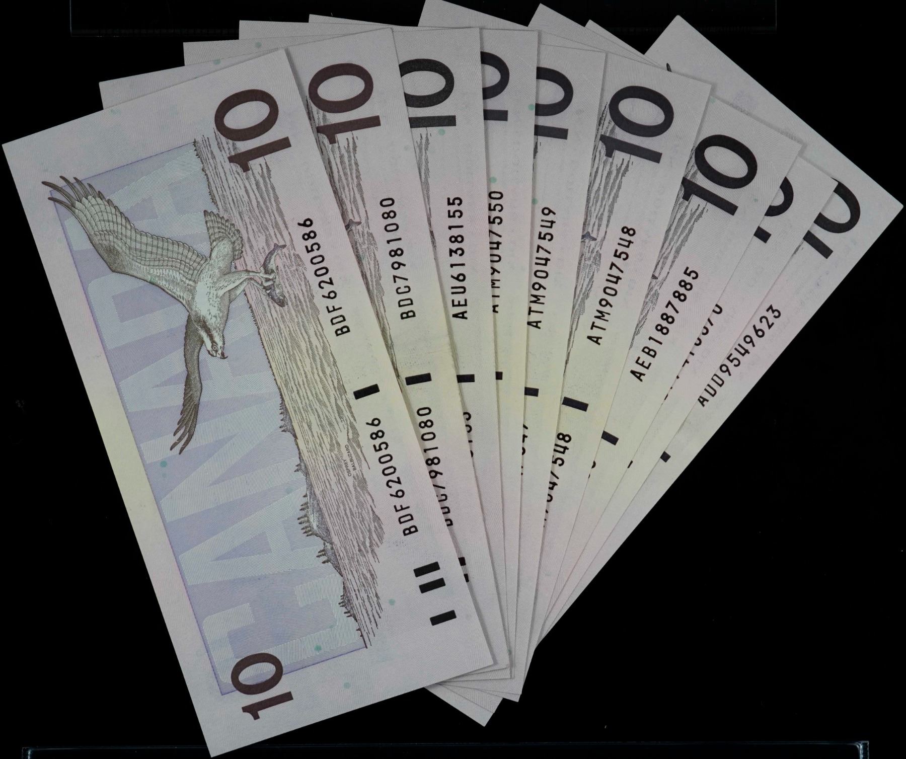 1989 $10 Lot; Includes various signatures & prefix. Some better ones. EF to Unc. Lot of 9 notes.