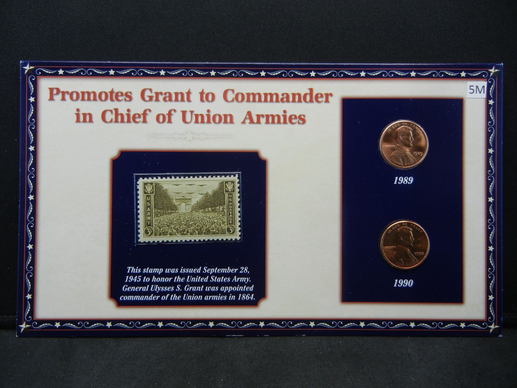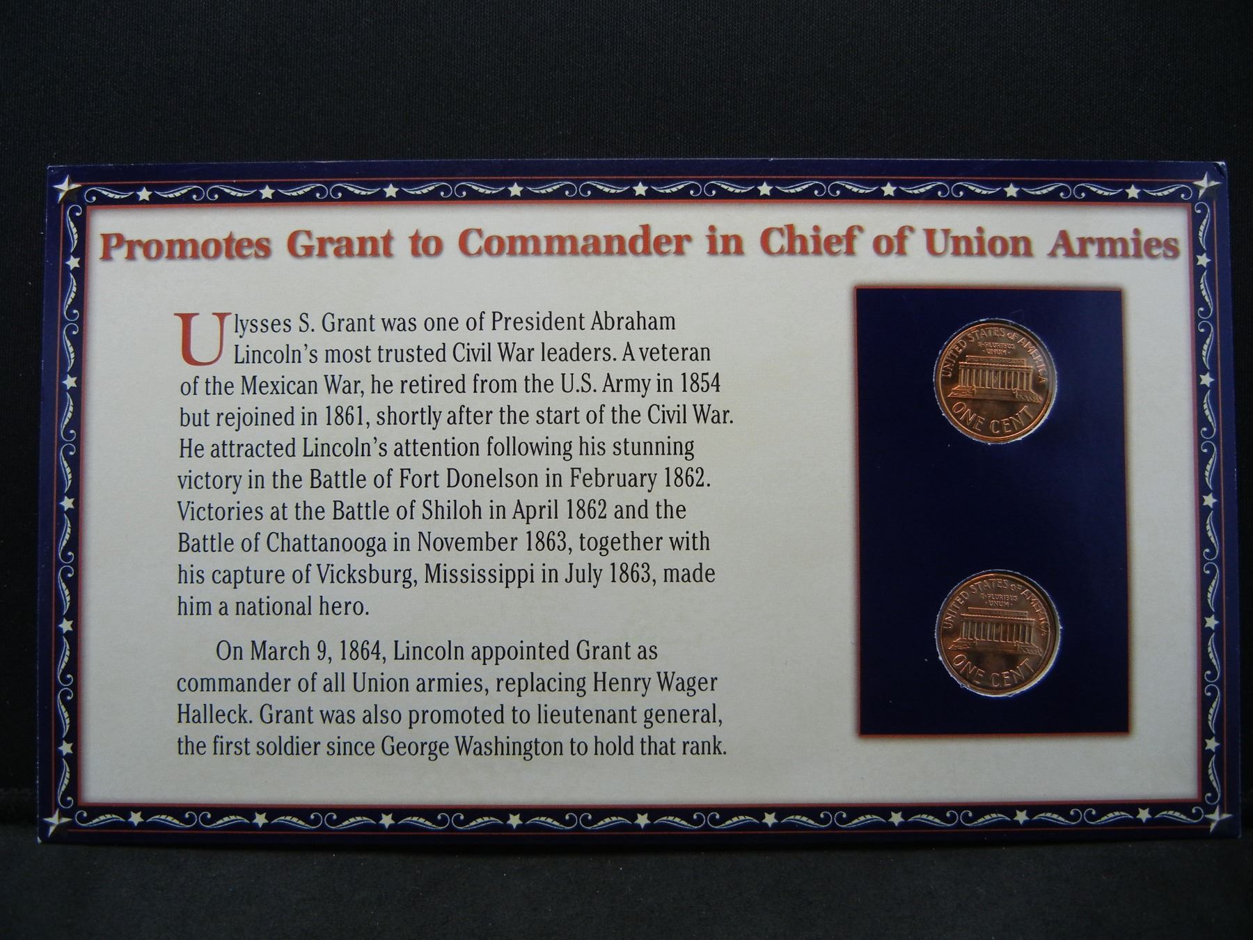 1989 & 1990 Historical Cents and Stamp Set Explaining Lincoln Appoints Grant Commander of Army.