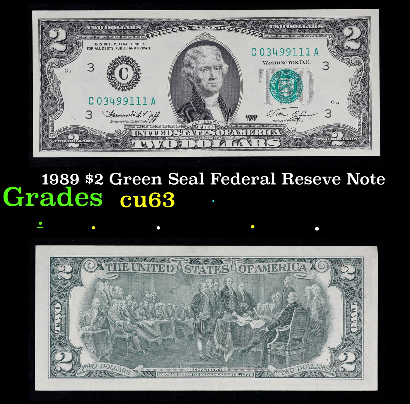 1989 $2 Green Seal Federal Reseve Note Grades Select CU.