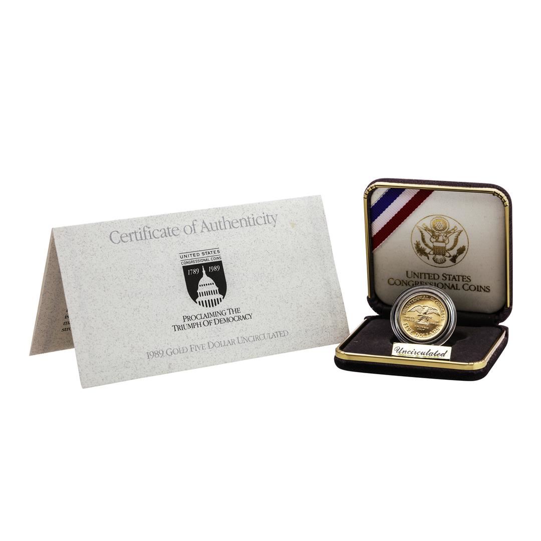 One 1989 $5 Congressional Commemorative Gold Coin with Box and COA.