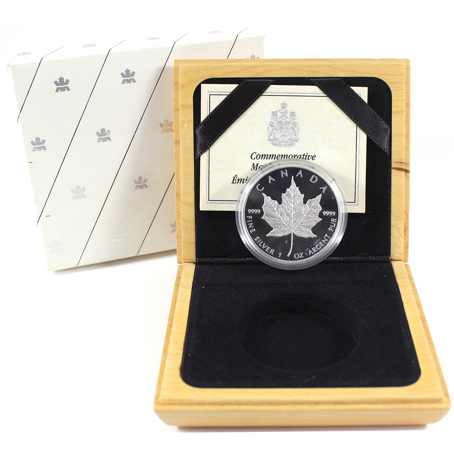 This coin was created to celebrate the 10th Anniversary of the Gold Maple Leaf. Minor scuffing on capsule, damage to inside of wooden box (Tax Exempt)