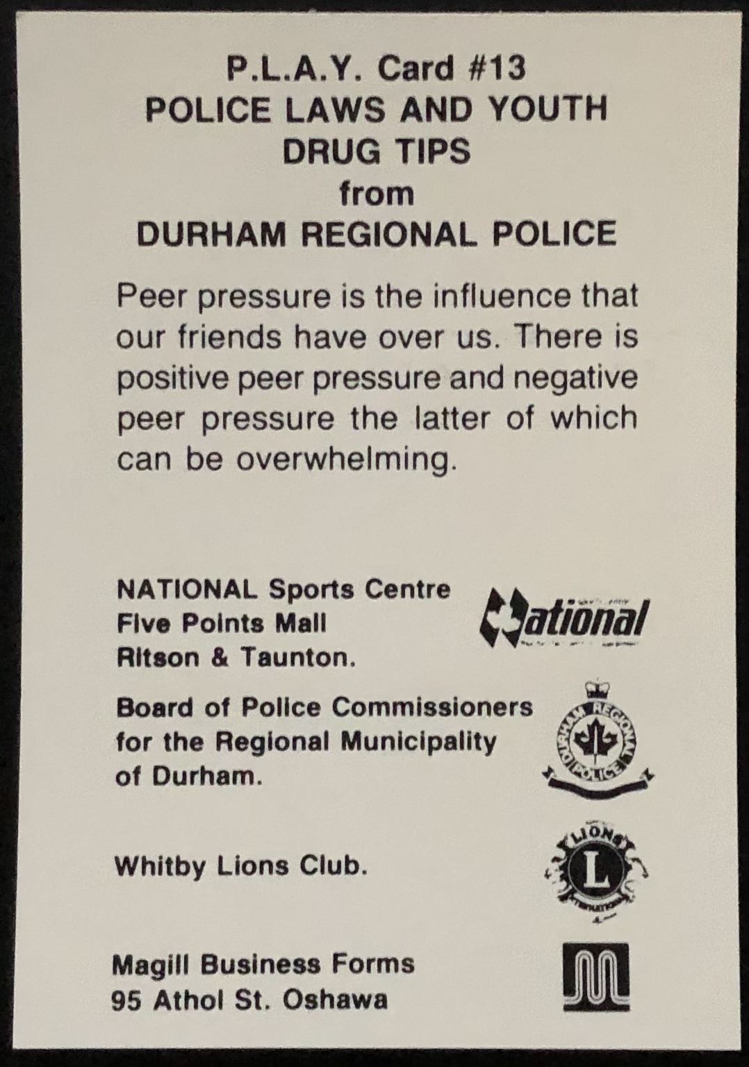 Card #13, issued by Durham regional police (Oshawa, Ontario) hockey, OHL, CHL, vintage, regional, rookie