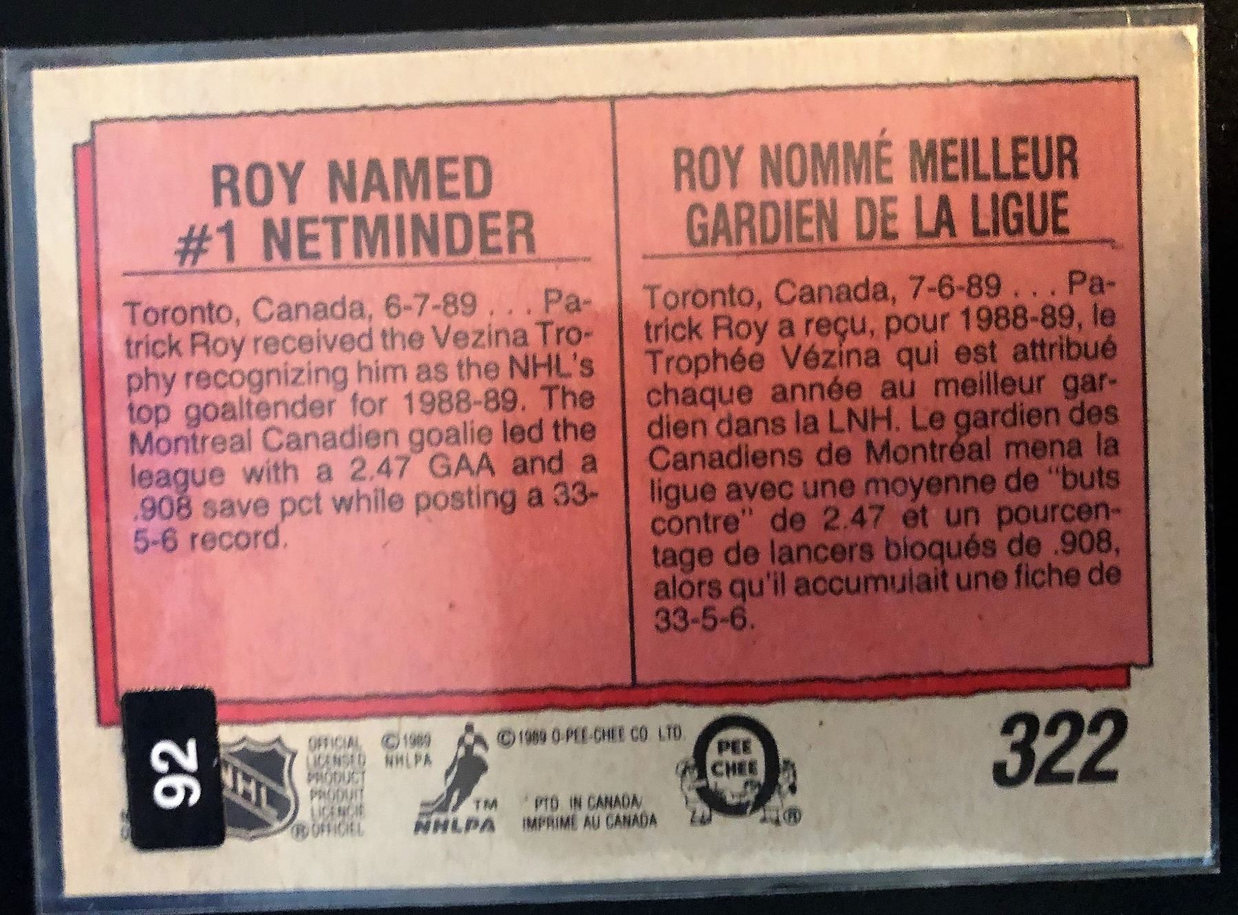 1989-90 O-Pee-Chee Patrick Roy Vezina Trophy Card #322