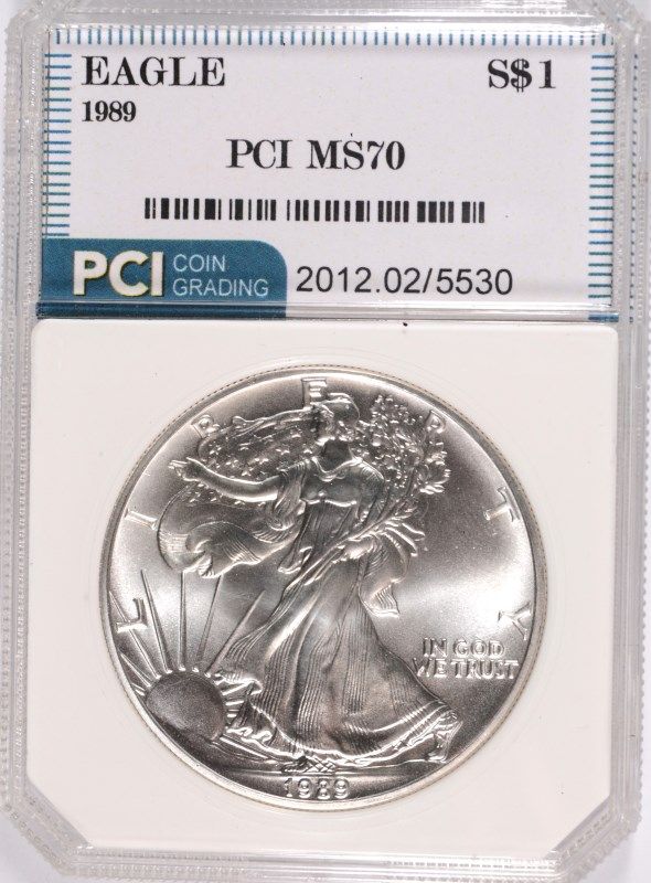 1989 AMERICAN SILVER EAGLE, PCI MS-70 RARE TRENDS PRICE $1600.00