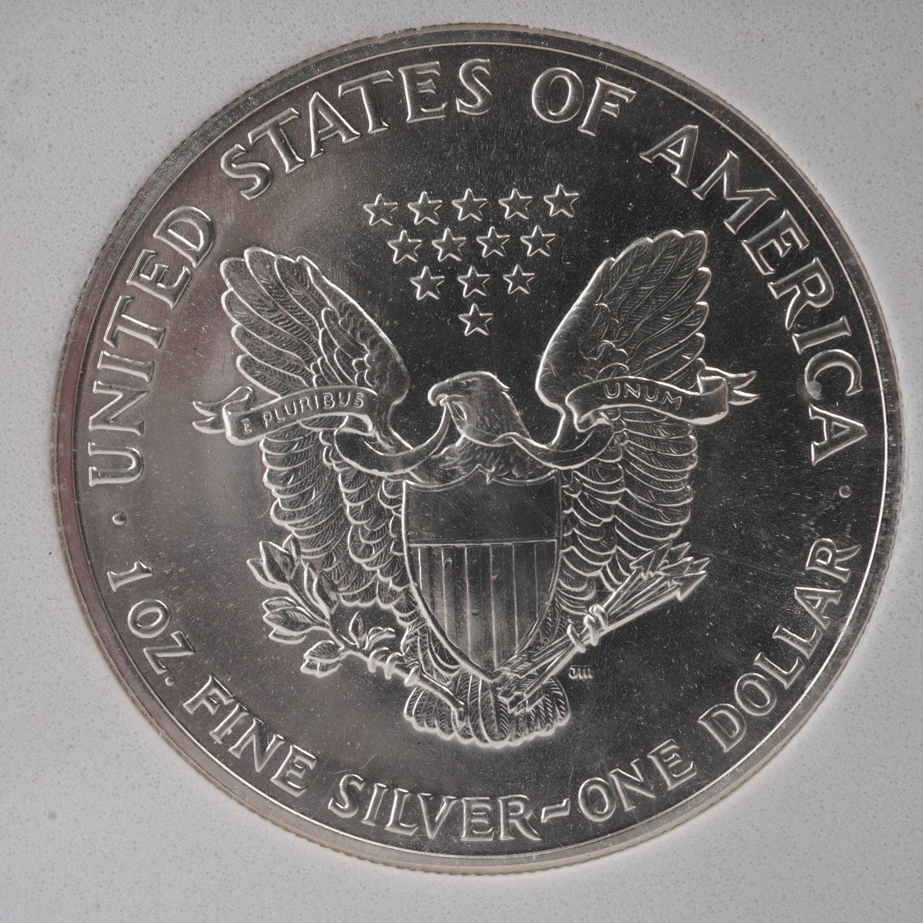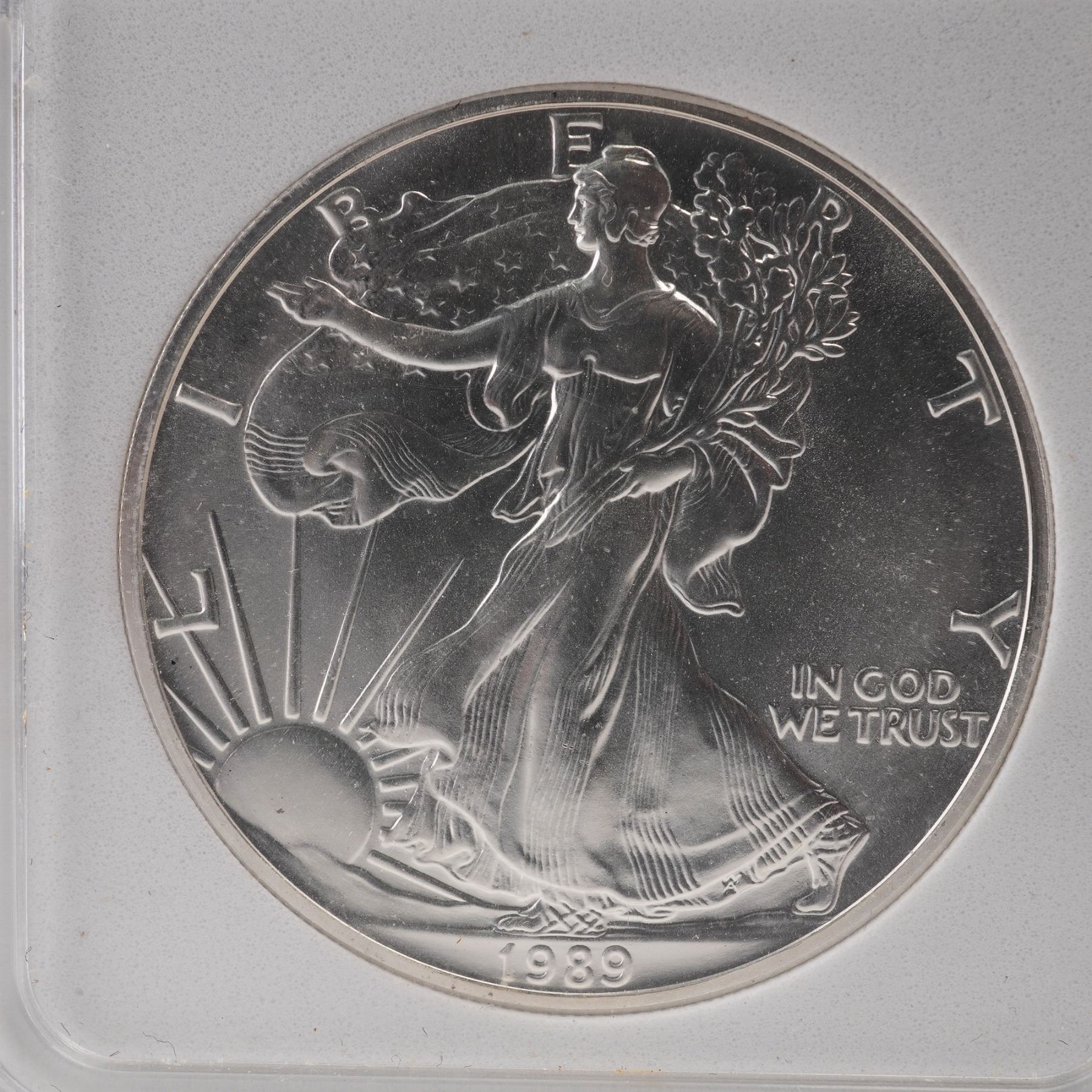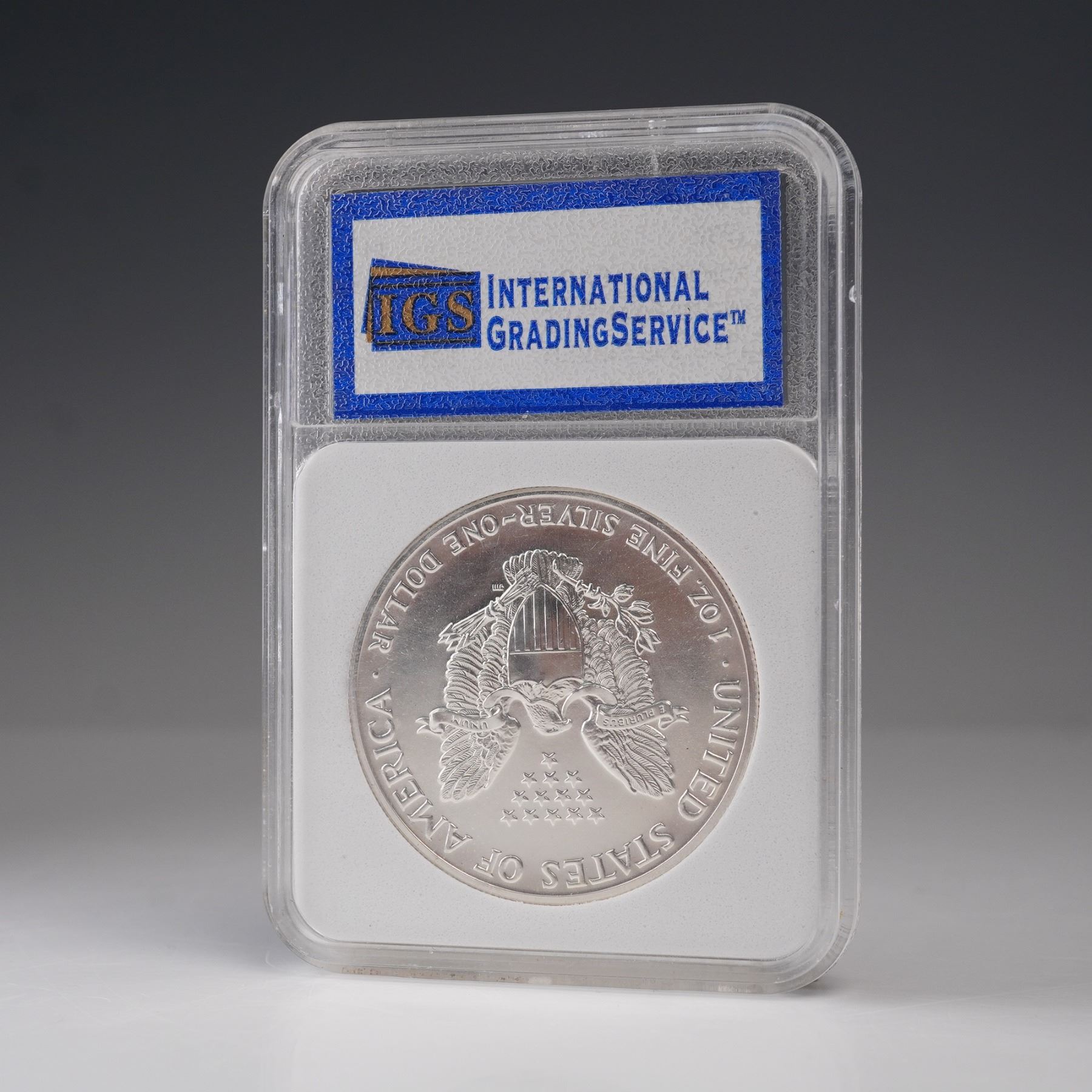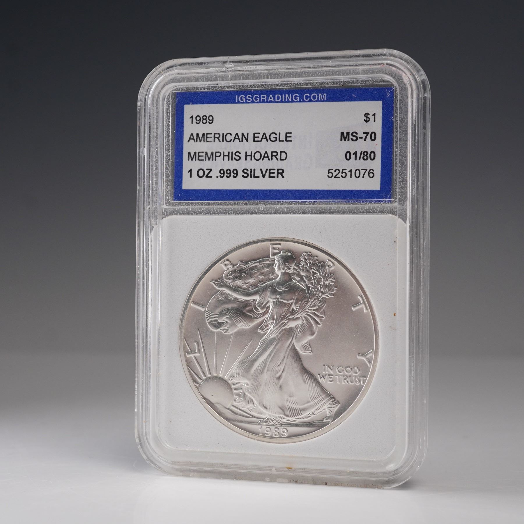 This 1989 American Silver Eagle is a one-ounce coin composed of .999 fine silver and graded MS-70 by the International Grading Service (IGS). The obverse side features the iconic Walking Liberty design created by Adolph A. Weinman, depicting Liberty striding confidently toward the sunrise. She is draped in the American flag, with her right hand extended and branches of laurel and oak held in her left hand. The reverse side showcases the heraldic eagle of the United States, designed by John Mercanti, which includes a shield, thirteen stars, an olive branch in the right talon, and arrows in the left. The coin bears inscriptions including UNITED STATES OF AMERICA, 1 OZ. FINE SILVER-ONE DOLLAR, and the motto E PLURIBUS UNUM on a ribbon. This example comes from the Memphis Hoard and is encapsulated in a tamper-evident IGS slab for preservation and authenticity. Slab: 2.25"L x 0.5"W x 3.25"H. Coin diameter: 39mm.