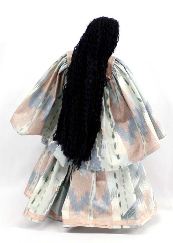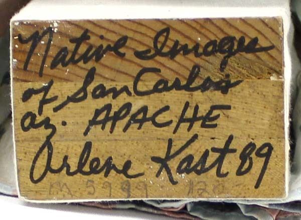 1989 Native American San Carlos Apache Doll by Arlene Kast, hand sewn traditional top and skirt, yarn hair and carved wood face, bottom is signed and reads ''Native Images of San Carlos Az. APACHE Arlene Kast 89'', measures 14.25''H x 4''W, FYI: ''Her dolls have been on exhibit at the Heard Museum'' ''Arlene Kast comes from a family of artists on the San Carlos Apache Reservation. Her unique dolls each feature some aspect of Apache culture.''