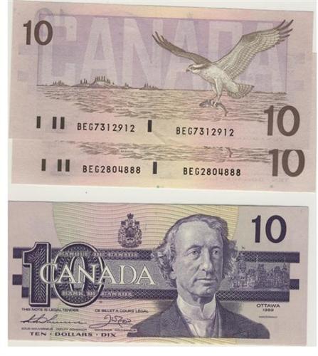 Crisp unc pair (one has a small diagonal pinch at the bottom) #BEG7312912 and BEG2804888, Knight-Thiessen (no return) BC-57c.