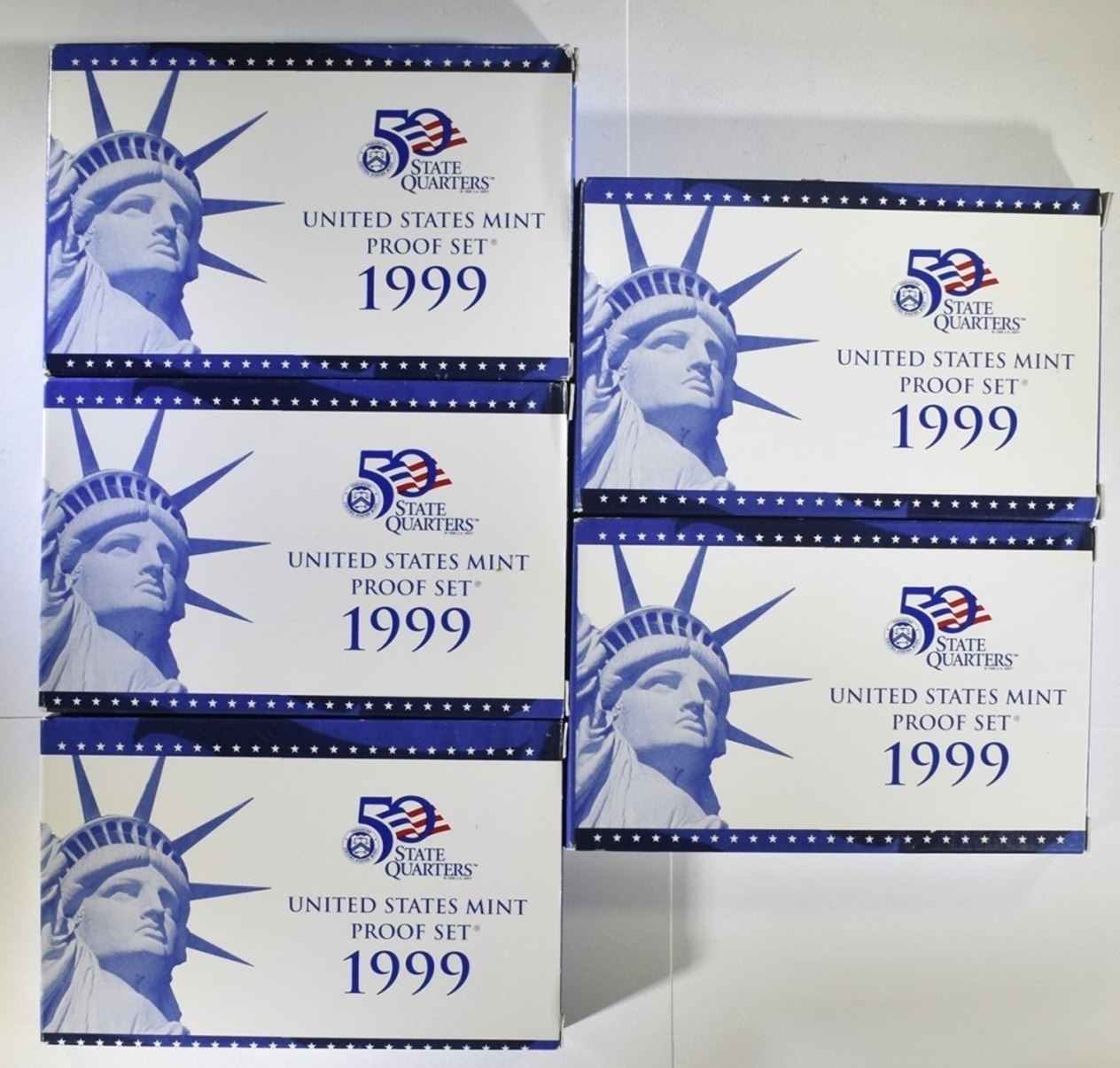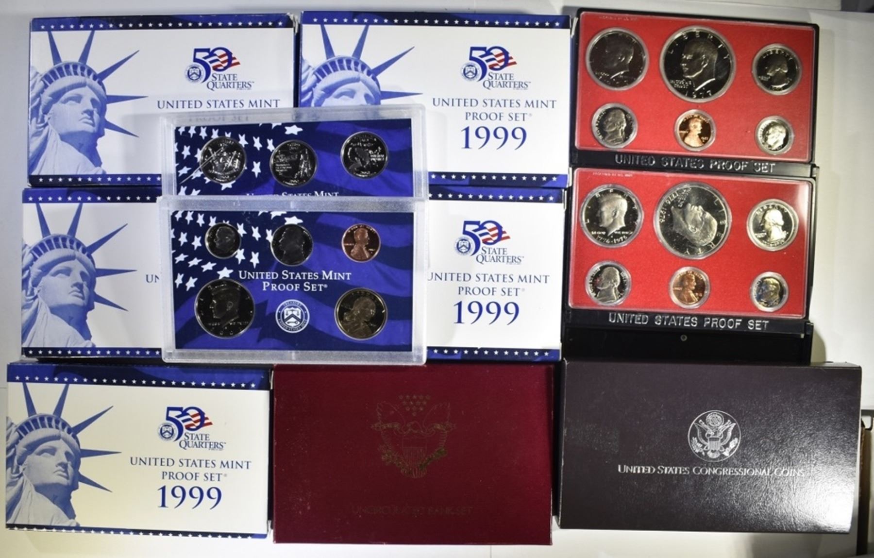 1992 BANK SET, 5 1999 US PROOF SETS ALL ORIGINAL PACKAGES, PLUS 1976, 1977, 2002 PROOF SETS NO BOXES ESTIMATE $90 - 110.