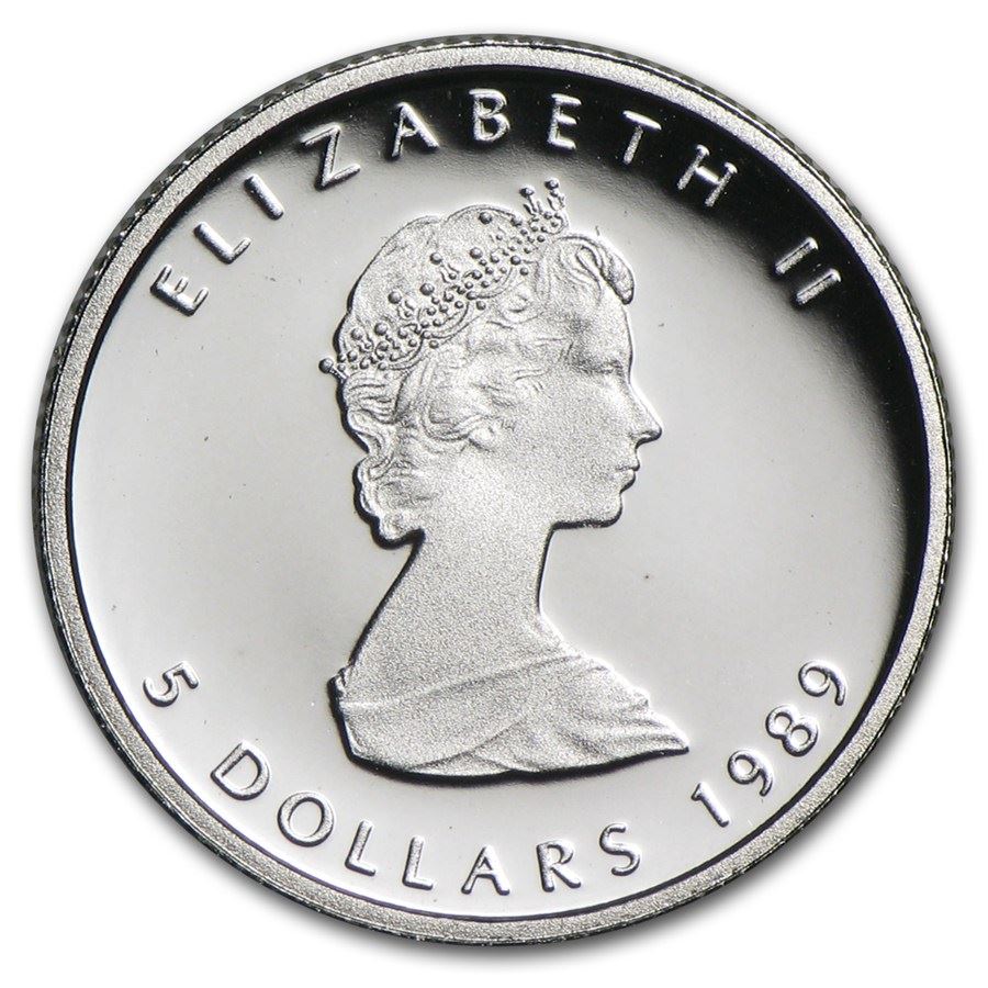 Product ID: 88405 Year: 1989 Grade Service: None Denomination: $5 Mint Mark: None Metal Content: 0.1 troy oz Purity: .9995 Manufacturer: Royal Canadian Mint Thickness: 1.13 mm Diameter: 16 mm