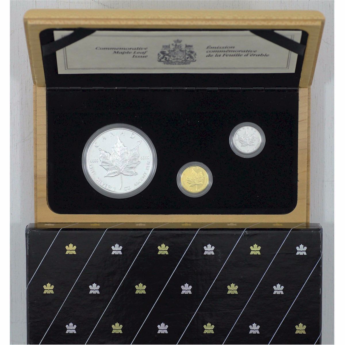 1989 Canada 10th Anniversary commemorative 3-Coin 1/10 Platinum, 1/10 Gold & 1 ounce Silver Maple Leaf Proof Set issued by the RCM. (Tax Exempt)
