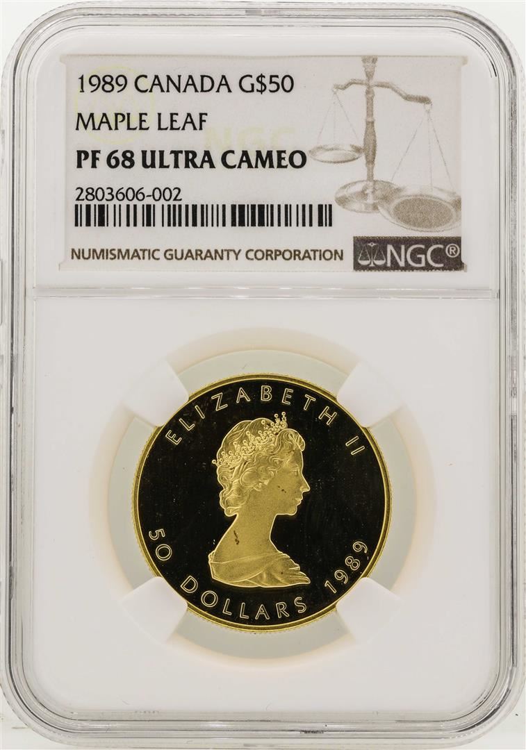 One 1989 Canada $50 Maple Leaf Gold Coin NGC PF68 Ultra Cameo. NGC Certified.