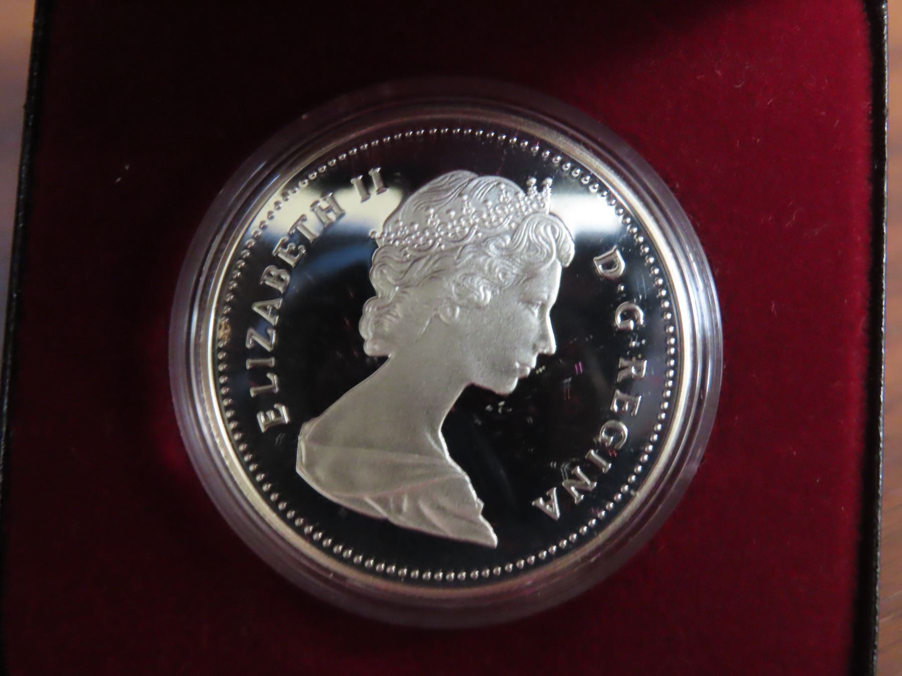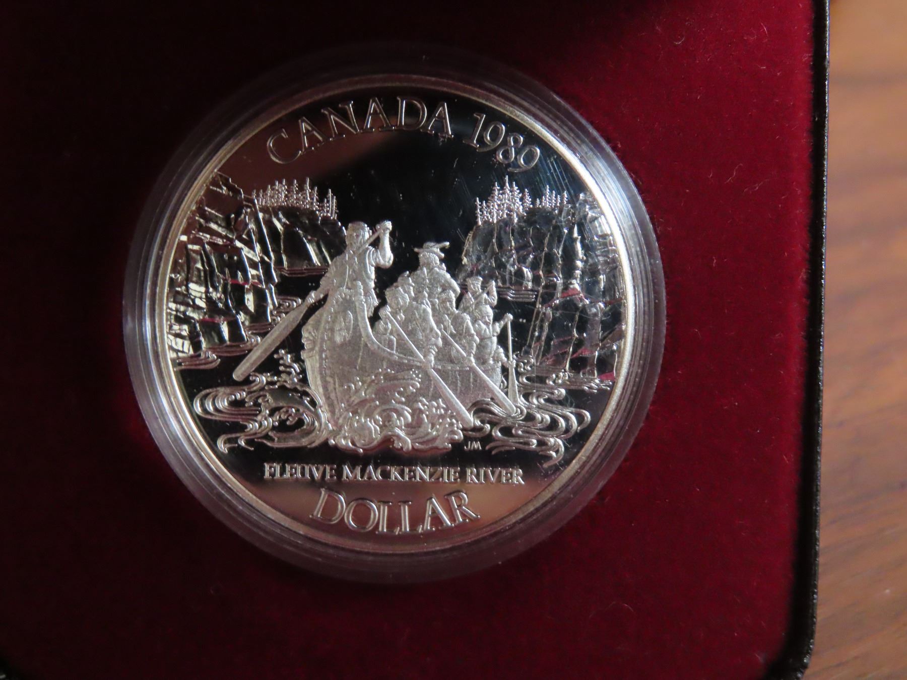1989 Canadian Proof Silver Dollar. Commemorates the 200th Anniversary of Alexander Mackenzie’s paddling down the Mackenzie River to the Arctic Ocean. Ultra Heavy Cameo. Housed in its original Royal Canadian Mint case of issue.