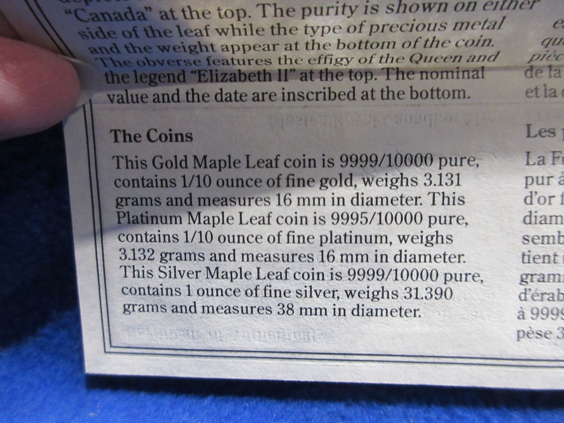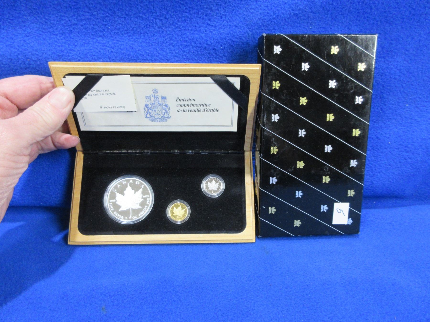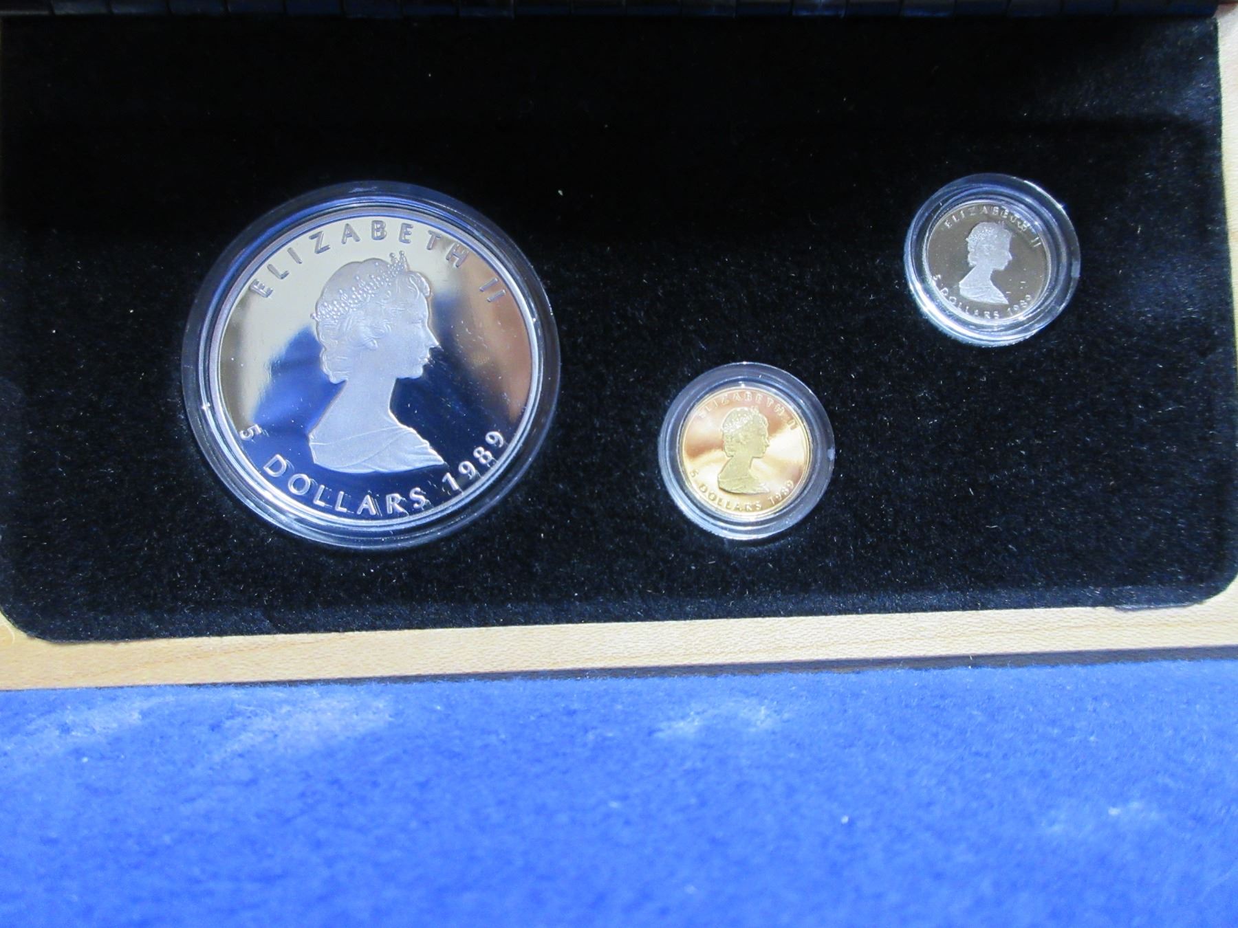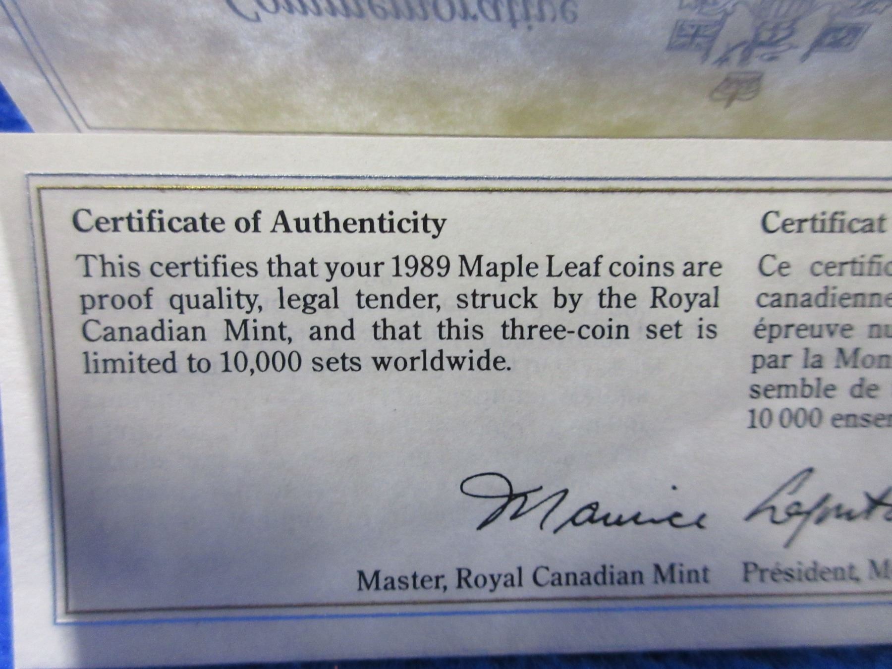 1989 Canadian Proof Three 5 Dollar Coin Set - .9999 Silver Maple Leaf 1 Ounce Coin, 1/10 Ounce Gold Coin, 1/10 Ounce Platinum Coin - 10,000 Sets Worldwide - In Original Display Box with Certification