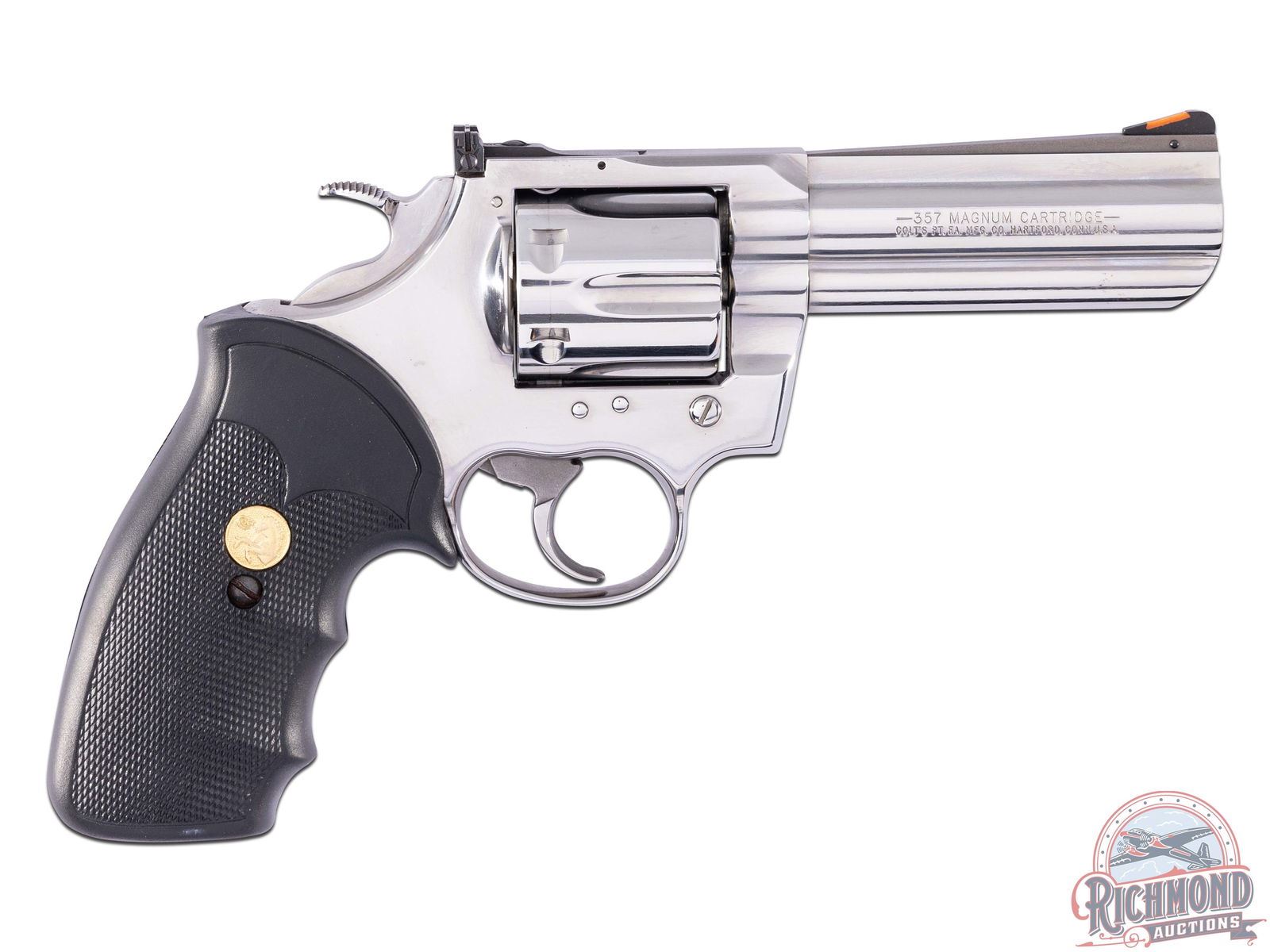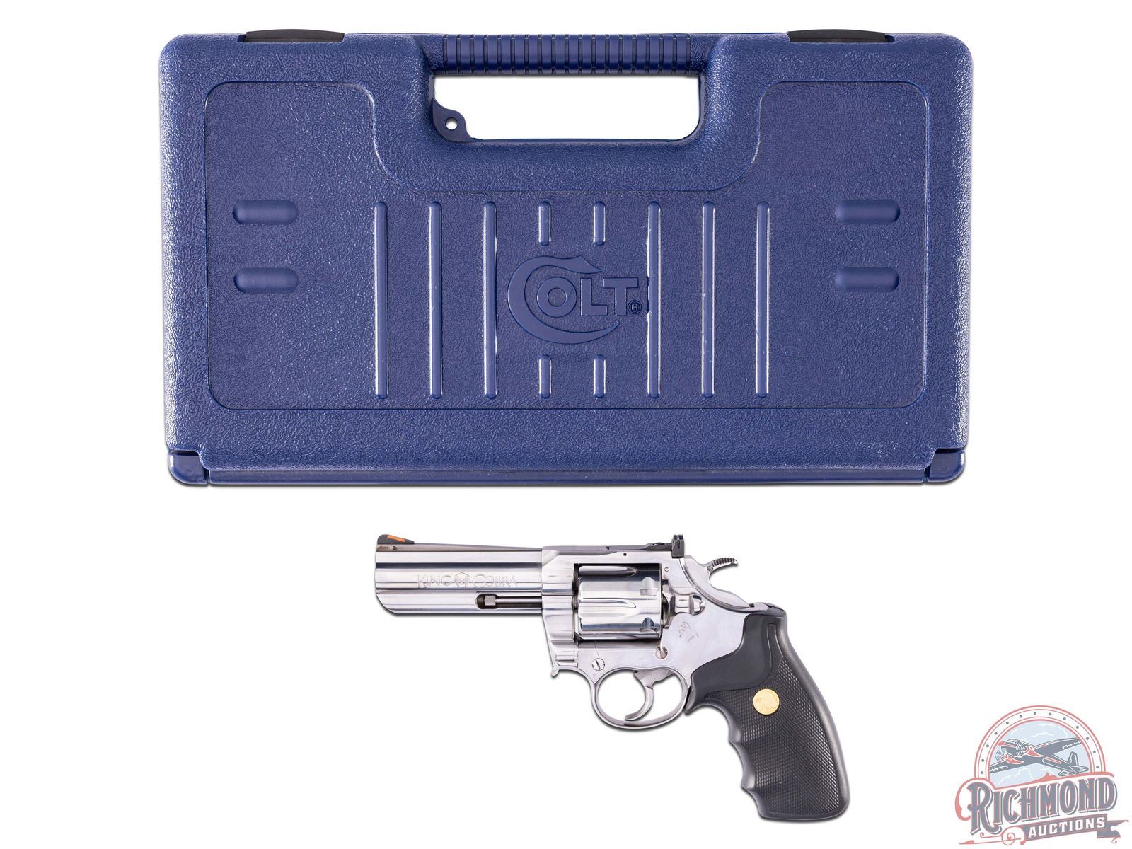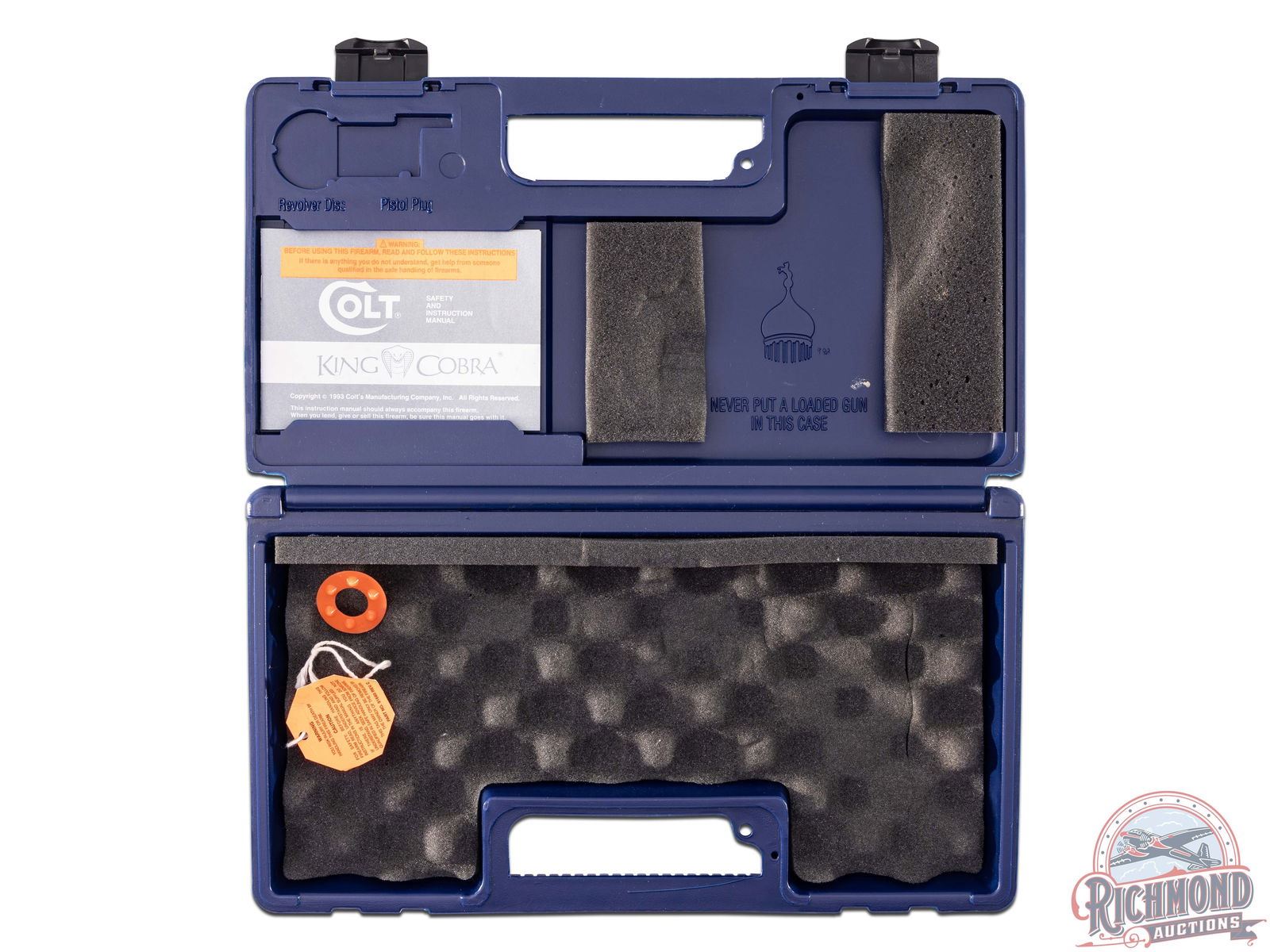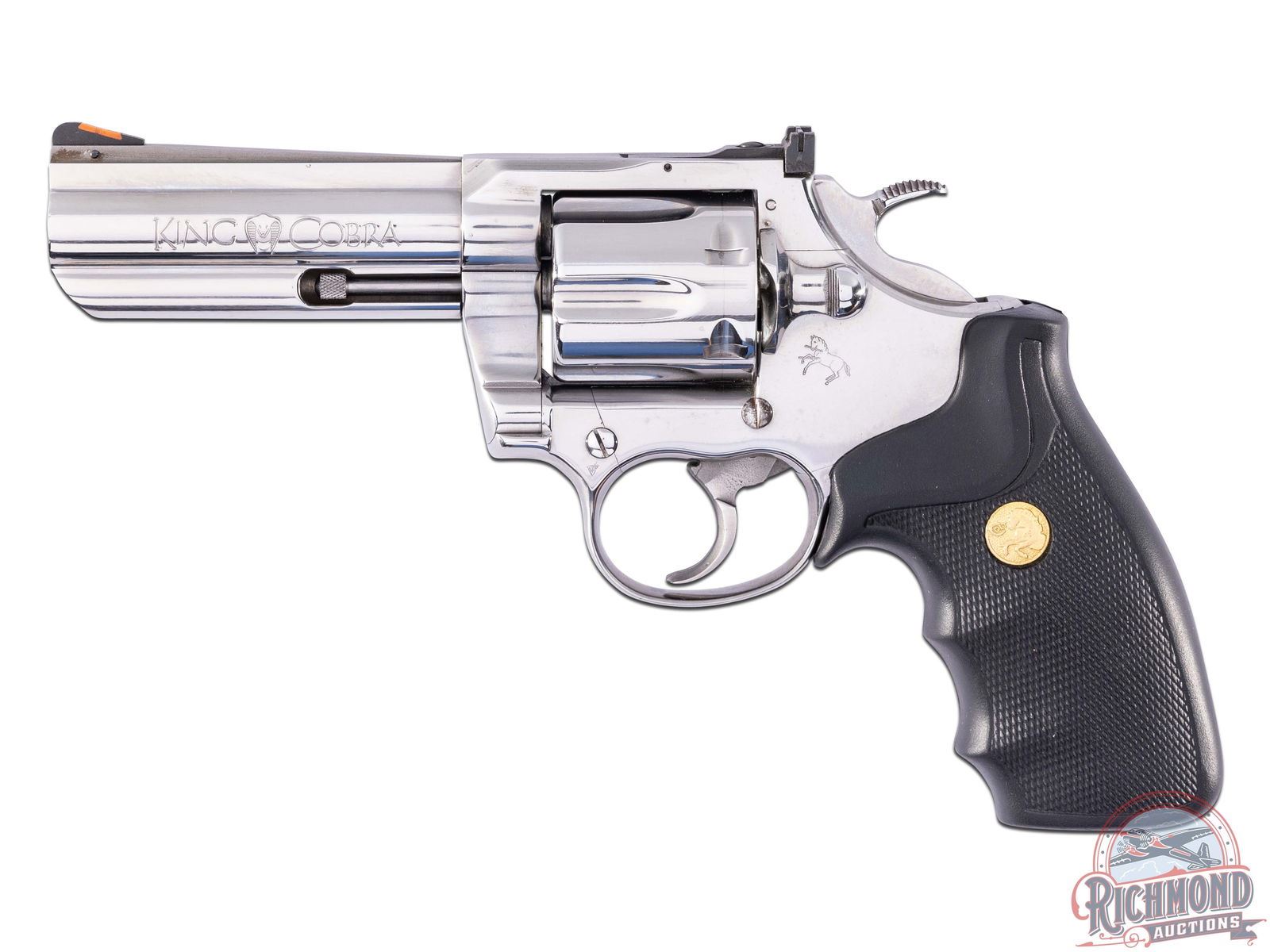 Manufactured 1989. This beautiful snake gun features a 4" barrel with full length shroud, rear white outlined adjustable notch sight and orange highlighted front ramp. Left side of the barrel is stamped "KING COBRA" with cobra image. Left side of the frame is stamped with the Rampant Colt logo closer to the cylinder. Special high polished stainless steel finish. Six round fluted, swing-out cylinder chambered for 357 Magnum cartridges. Fitted with factory Colt checkered, finger grooved rubber grips with gold tone Colt medallions. Comes in a Colt factory hard case with Colt King Cobra manual. CALIBER: 357 MAG. S/N: 8KC119. FFL STATUS: Modern.