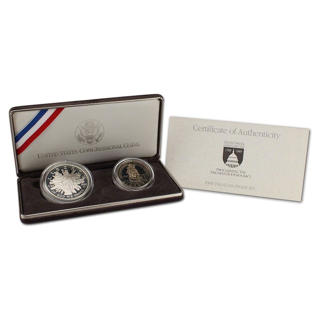 1989 Congrassional Uncirculated Commemorative 2 Coin Set. This Congressional 2 Piece Commemorative set incluses the proof Dollar Commemorative and 50c Commemorative, all Congressional.