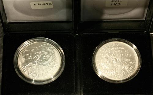 Pair of 1oz .999 fine silver 10 Peso BU coins. In original cases issued to commemorate the 30th Anniversary of the Cuban Revolution. One coin features reverse design of Jose Marti & Fidel Castro. Second coin design features Camilio Cienfuegos with Fidel Castro. KM#242, 243 no return.