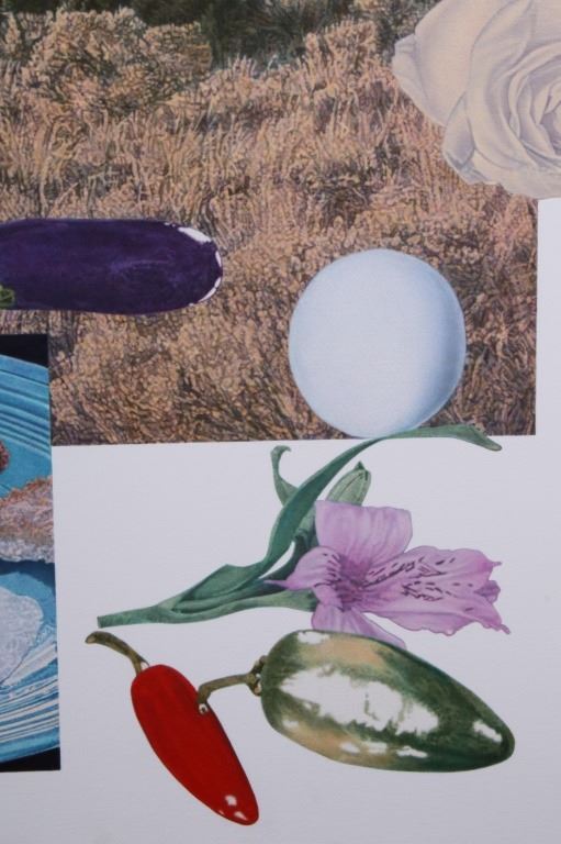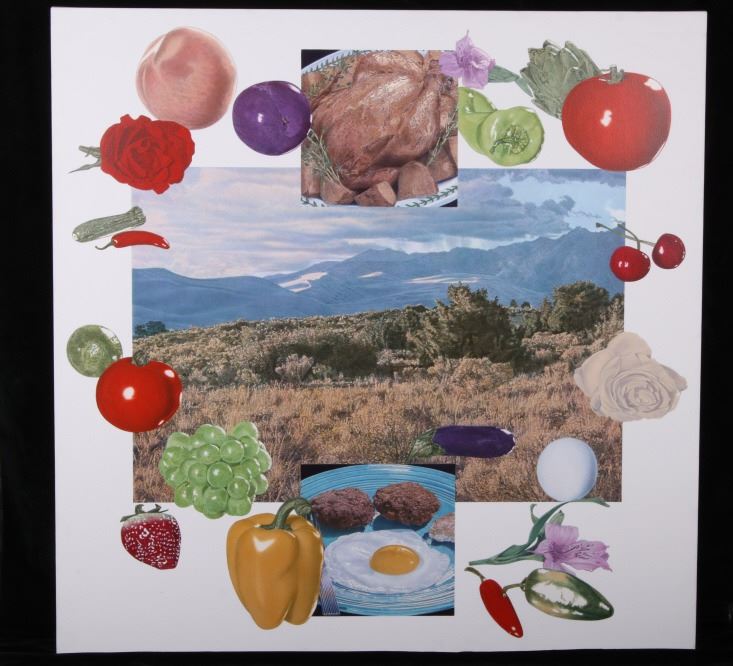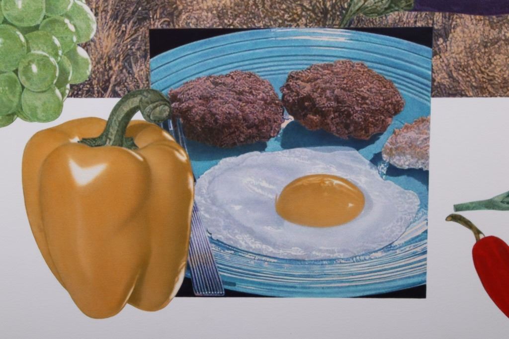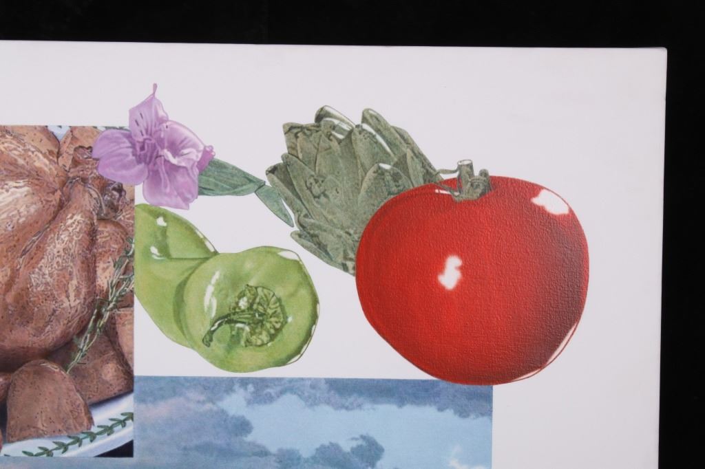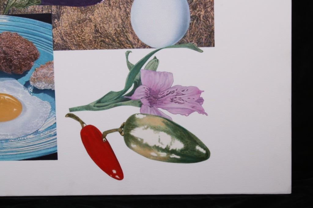 For your bidding pleasure is this Acrylic painting on canvas called Memory and Imagination by Don Eddy from 1989. Done Eddy was considered one of the first Photo Realist artists however has his recent work delves into the realm of metaphysics. This is a wonderful acrylic on canvas painting, showing different kinds of food all surrounding a picturesque view of the high desert. The condition of this painting is good with no obvious signs of damage, showing slight surface dirt along the border. The measurements of this painting are 80" x 80" framed canvas.