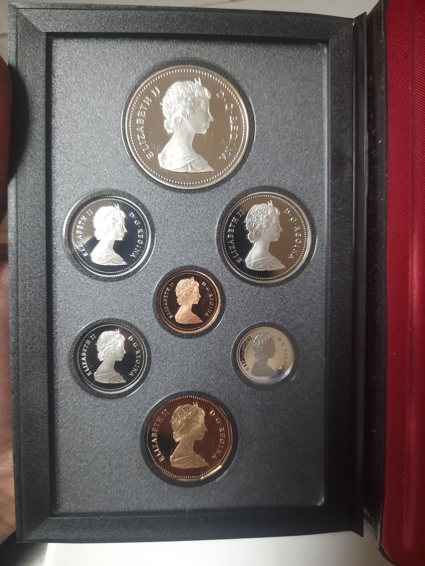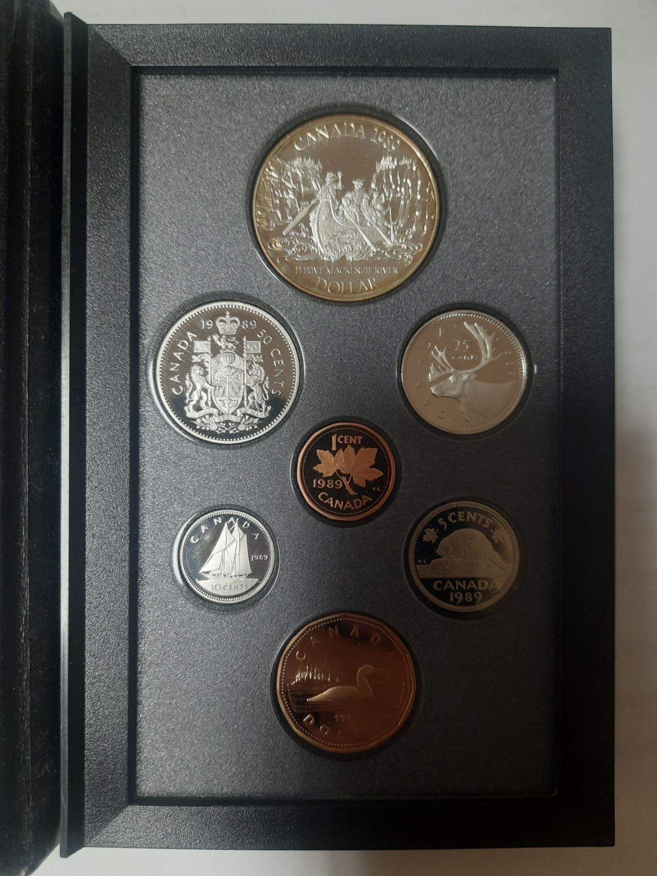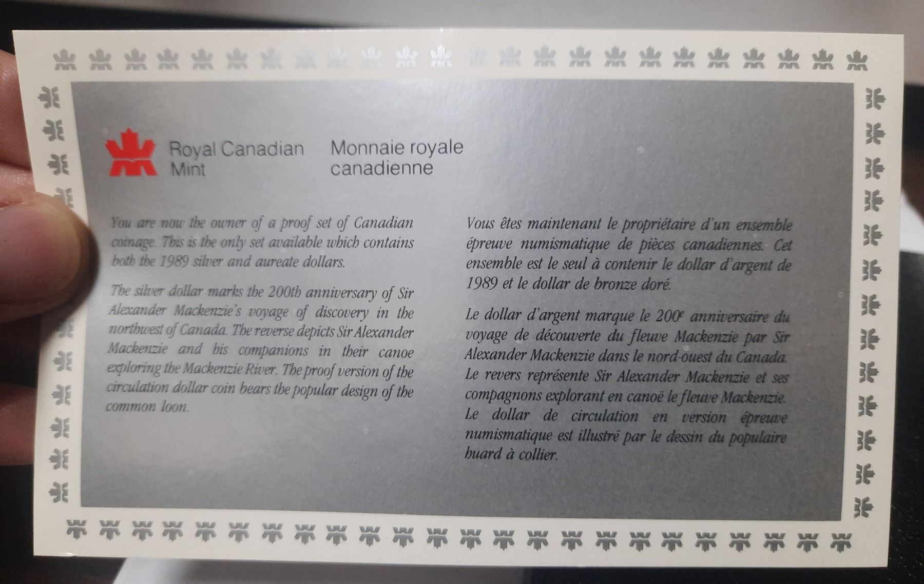 1989 Double Dollar Proof Set. 7-coin set includes a Silver Dollar that commemorates the 200th Anniversary of Alexander Mackenzie’s voyage down the Mackenzie River to the Arctic Ocean. Proof with Ultra Heavy Cameos.