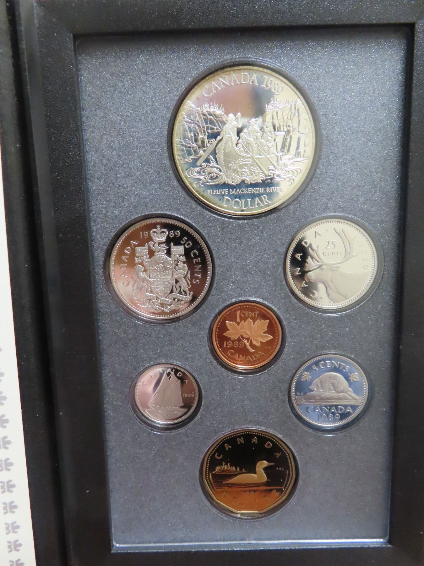 1989 Double Dollar Proof Set. Silver Dollar commemorates the 200th Anniversary of fur trader and explorer Alexander Mackenzie’s trip down the Mackenzie River to the Arctic Ocean. Proof with Ultra Heavy Cameos. Housed in its original Royal Canadian Mint case of issue. Includes Certificate of Authenticity.
