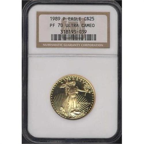 <b>1989 Gold Eagle $25. NGC graded PF70 UC.</b> Collector's Universe price: $1350. Impressively struck on the obverse and reverse, the resounding gold tone resonates to the eye. Perfect ultra cameo surfaces <b>(PCGS # 9833)</b>