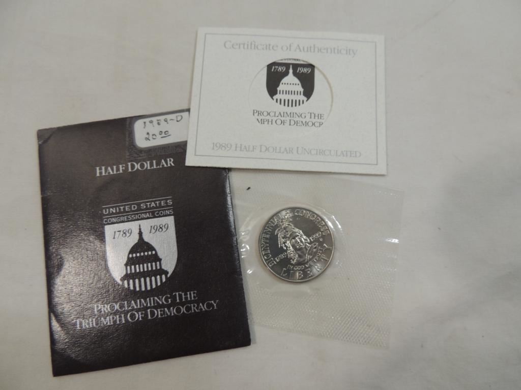 1989 HALF DOLLAR PROCLAIMING THE TRIUMPH OF DEMOCRACY. COIN COLLECTIBLE, COIN COLLECTORS, VINTAGE COIN, CURRENCY COLLECTIBLE, AS SHOWN SEE PHOTO FOR MORE DETAILS.