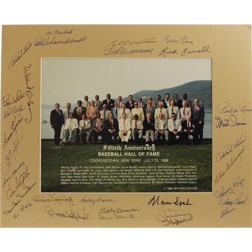<B>1989 Hall of Fame Induction Ceremonies Multi-Signed Photograph.</B></I> Official group portrait snapped at the fiftieth anniversary of the opening of the Baseball Hall of Fame in Cooperstown derives from the personal collection of the Hall's top corporate sponsor. These beautiful oversized displays were made available only to players and a very few VIP's, and were never offered to the general public. The mat surrounding the photo bears the 10/10 black and blue sharpie signatures of thirty-one Hall of Famers pictured, including Ted Williams, Banks, Reese, Kiner, Gehringer, Mize, Bench, Spahn, Musial, Roberts, Stargell, Snider, Sewell, Yastrzemski, Killebrew, McCovey and many more. Total dimensions 16x20". <I>LOA from PSA/DNA. LOA from James Spence Authentication.</B></I><BR><BR><b>Shipping:</b> Flat Material, Large (<a target="_blank" href="http://www.heritageauctions.com/common/shipping.php">view shipping information</a>)