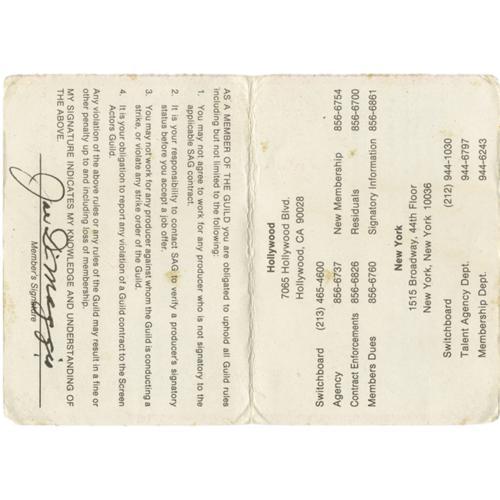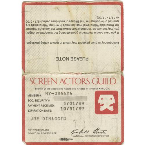 <B>1989 Joe DiMaggio Signed Screen Actors Guild Membership Card.</B></I> Official membership card allowed the Yankee Clipper to appear in any union production, perhaps a Mr. Coffee commercial. Typed details note his membership number, social security number, date of payment received and membership expiration date, as well as his name. Verso holds a 10/10 black ink signature. Card shows expected wear from a year in DiMaggio's wallet. Letter of provenance from the DiMaggio family signed by both granddaughters. <I>LOA from PSA/DNA. LOA from James Spence Authentication.</B></I><BR><BR><b>Shipping:</b> Flat Material, Small (<a target="_blank" href="http://www.heritageauctions.com/common/shipping.php">view shipping information</a>)