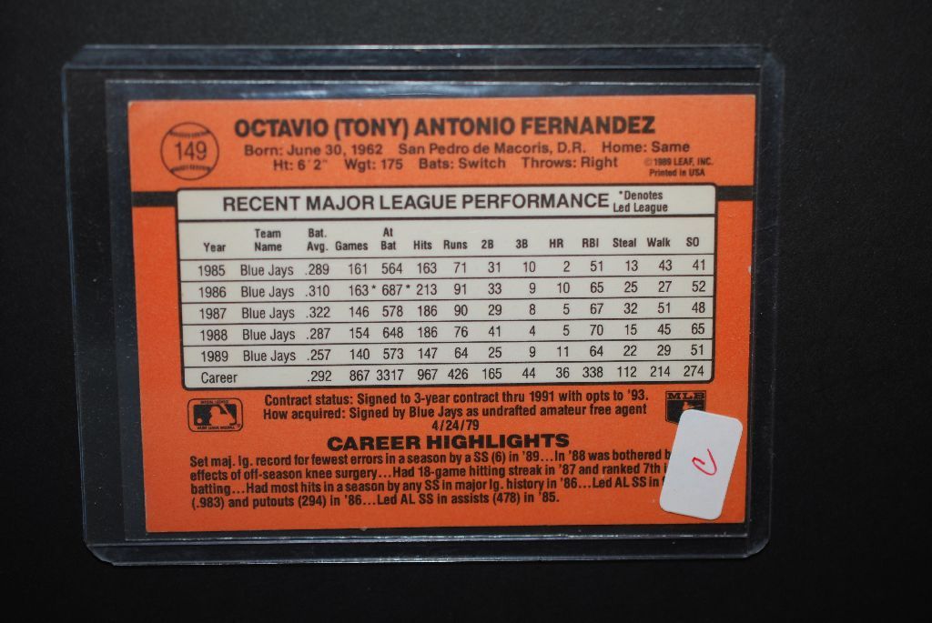 1989 MLB Tony Fernandez Toronto Blue Jays Baseball Trading Card; EST. $5-10
