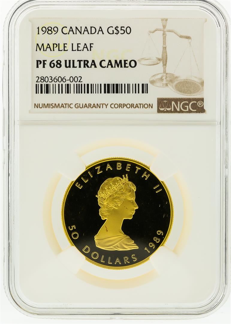 One 1989 NGC PF 68 Ultra Cameo Canada $50 Maple Leaf 1 Oz. Gold Coin. NGC Certified.