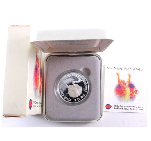 1989 New Zealand proof sterling silver dollar commemorating the Commonwealth Games in Auckland.