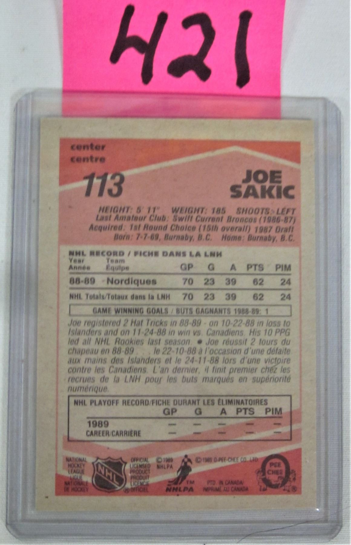 1989 O-Pee-Chee Joe Sakic Quebec Nordiques rookie card #113