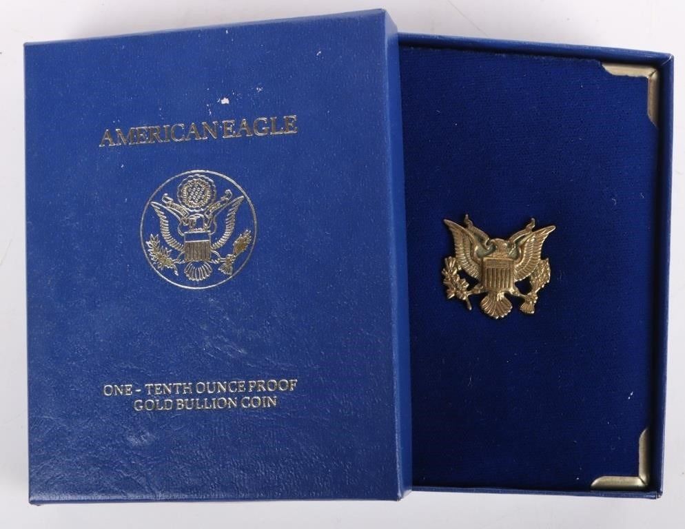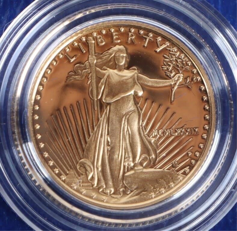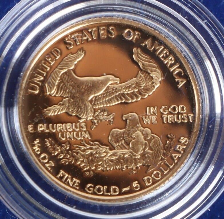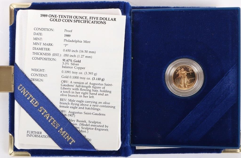 1989 P 1/10 oz Proof $5 fine gold American Eagle bullion coin. This coin is encased in original U.S. Mint packaging includes a COA and all specifics for the coin.