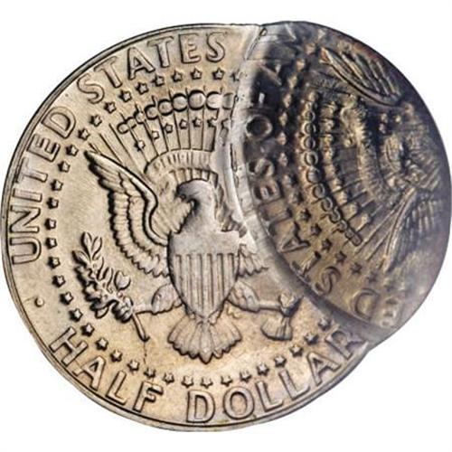 <B>1989-P 50C Kennedy Half--Double-Struck, Second Strike 60% Off-Center--MS64 NGC.</B></I> This Kennedy error received a centered initial impression from the dies, but failed to clear the striking area and turned approximately 90 degrees counterclockwise before receiving another blow from the press, this one 60% off-center toward 3 o'clock on the obverse. With two full mintmarks and one-and-a-half dates, this is a highly desirable multiple-strike error. Green-gold and violet shadings visit each side.<BR><BR><B>Coin Engraver:</B> Gilroy Roberts and Frank Gasparro<BR><BR><b>Shipping:</b> Coins & Currency (<a target="_blank" href="http://www.heritageauctions.com/common/shipping.php">view shipping information</a>)