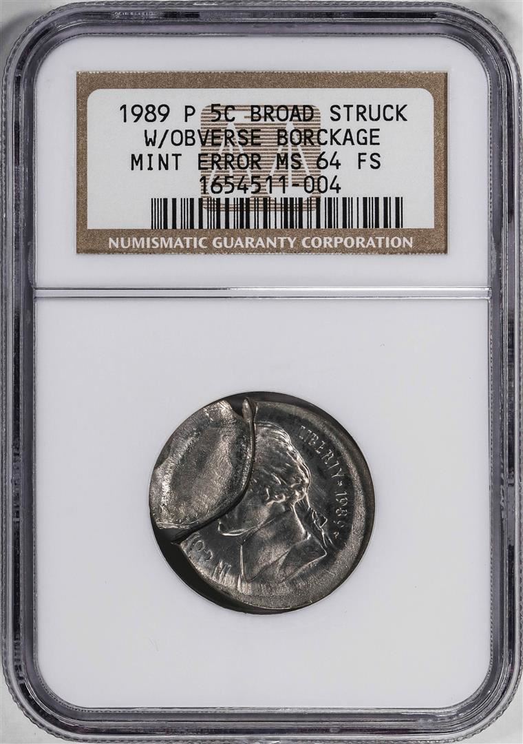 One 1989-P Jefferson Nickel Mint ERROR Broad Struck With Obverse Brockage NGC MS64FS. NGC Certified.