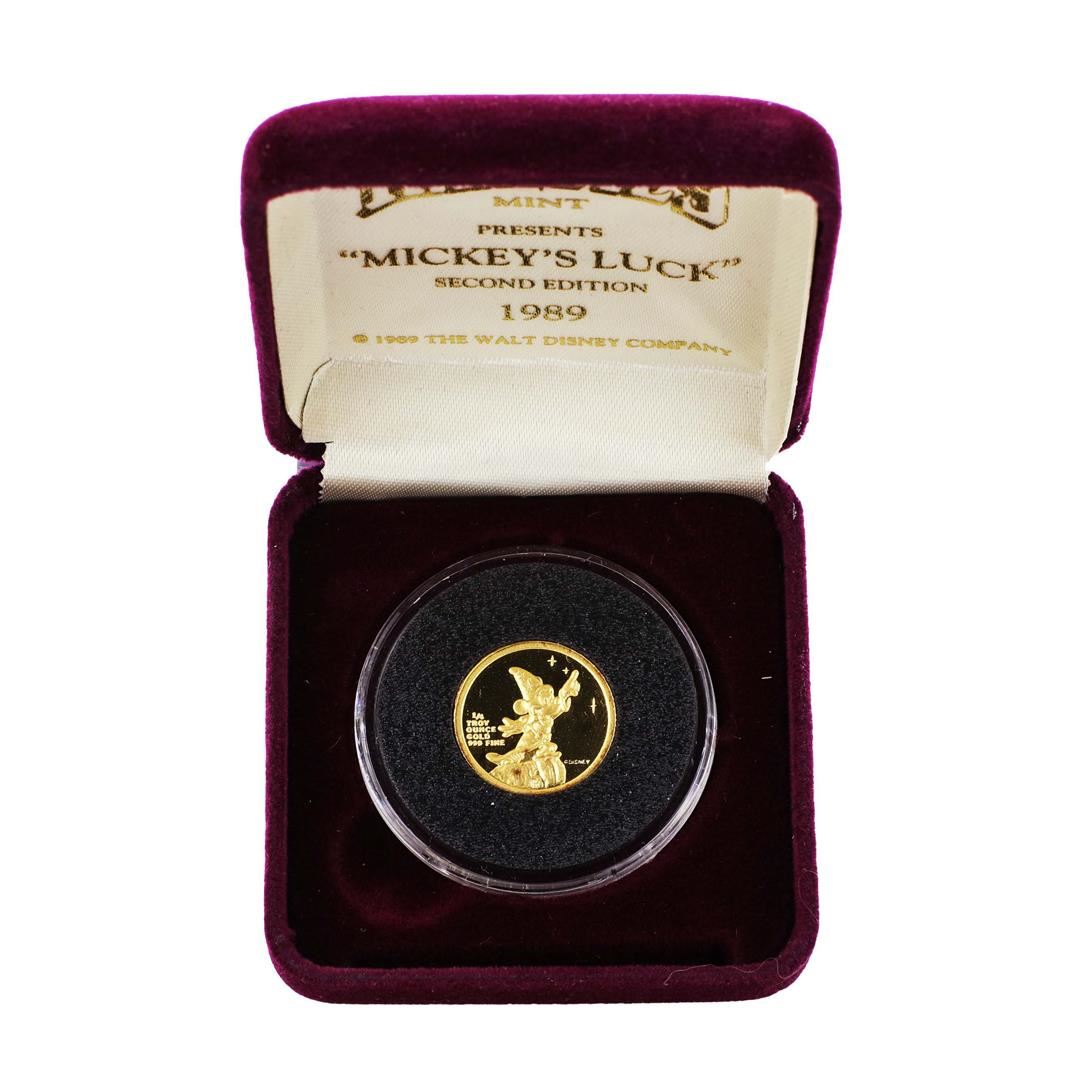 One 1989 Rarities Mint Disney Mickey Good Luck 1/4 Oz. Gold Coin w/ Box.