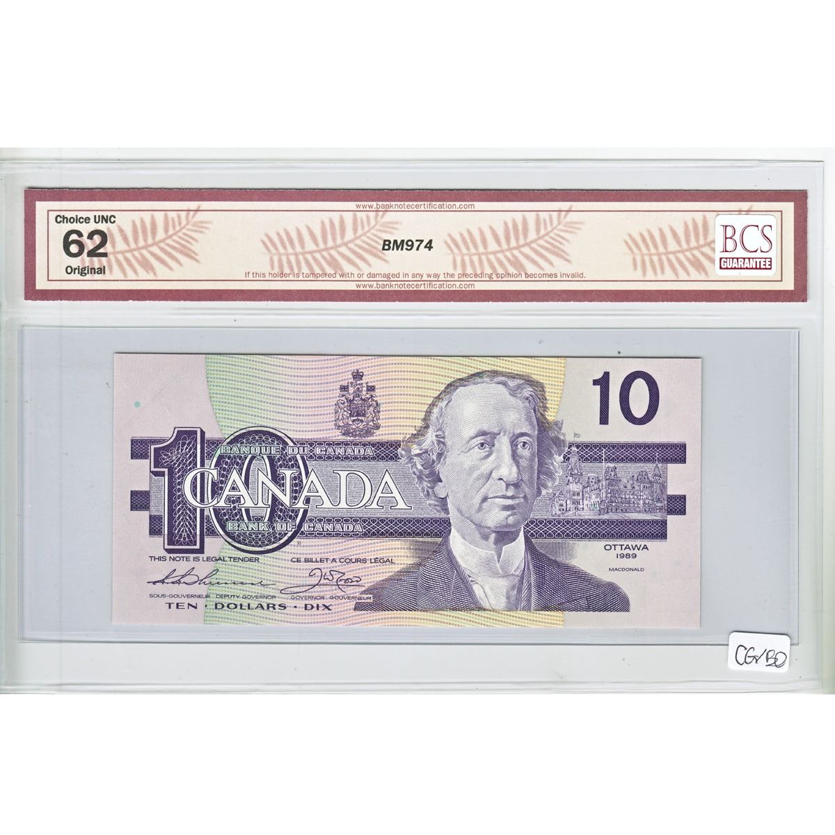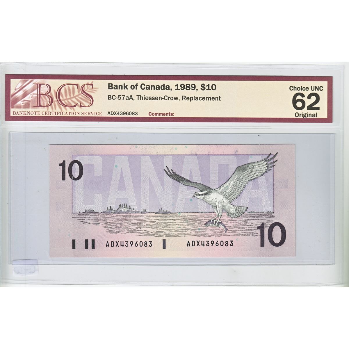 1989 Replacement $10.00 Note from the Bank of Canada; cat code BC-57aA, Thiessen-Crow signatures, Prefix ADX, BCS Certified CUNC-62, Original. Buyers Premium will be added on all items as per our terms of sale. We accept Paypal, Credit Card, E-Transfer Payments, Cheque or Money Orders (there is an additional 3% fee for using Paypal or Credit Card). All invoices will be emailed immediately following the auction, please contact us if you would like to pay by credit card or receive a new revised lower total for mailing in payment or sending an e-transfer (3% discount). All Items Are Sold "AS IS", no returns