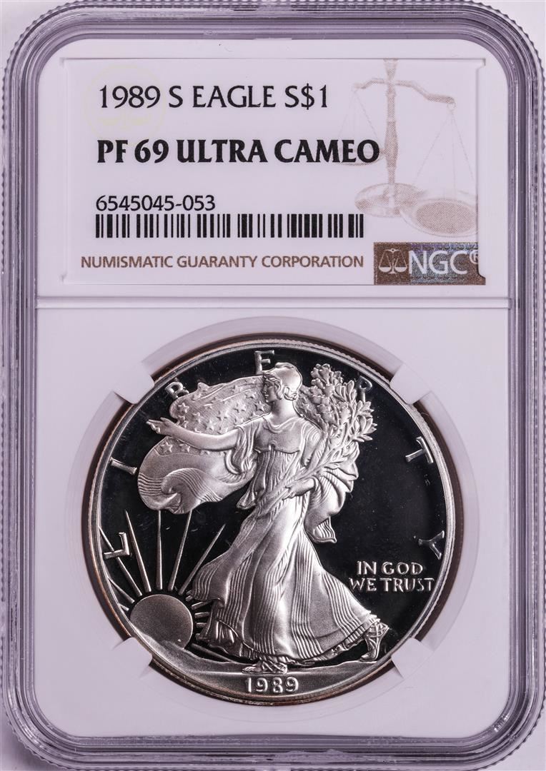 One 1989-S $1 Proof American Silver Eagle Coin NGC PF69 Ultra Cameo. NGC Certified.