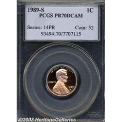 1989-S 1C PR70 Deep Cameo PCGS. Exquisitely detailed with bright, salmon-pink devices and deeply reflective, jet-black fields. The surfaces have a lovely, granular, orange-peel texture (as struck) and seem to be pristine. Population: 33 in 70, 0 finer (10/03).From the John Troy #1 PCGS Registry Set Collection. Important notice: Heritage usually auctions material at the rate of 200-250 lots per hour. On some occasions eBay Live bid software or the Internet may not be able to keep up with the pace of the auction. We recommend placing a realistic absentee bid now as insurance to avoid disappointment. Occasionally the auctioneer may eliminate or reject an eBay Live bid, and the auctioneer may also reopen a lot after the close of the eBay live bidding (usually because we missed an audience bid), and may reject your bid even if it shows you as the winning bidder. By bidding via eBay Live, you agree that Heritage may award the lot to another bidder at its sole discretion under the circumstances described above or any other reasonable circumstances. Also please note that all Heritage lots purchased through eBay Live carry a 20% Buyer's Premium. Please make sure you read the Terms and Conditions before you bid.