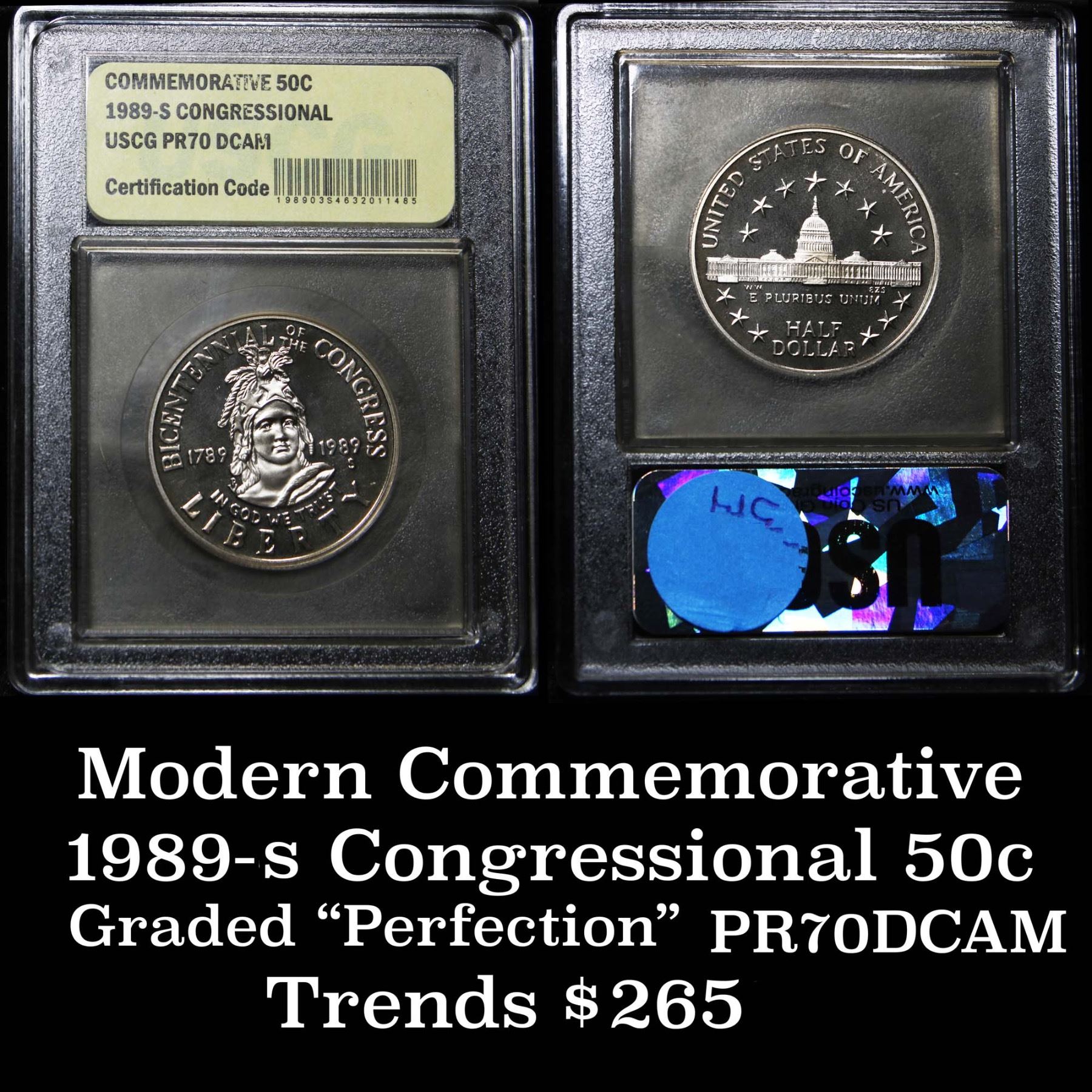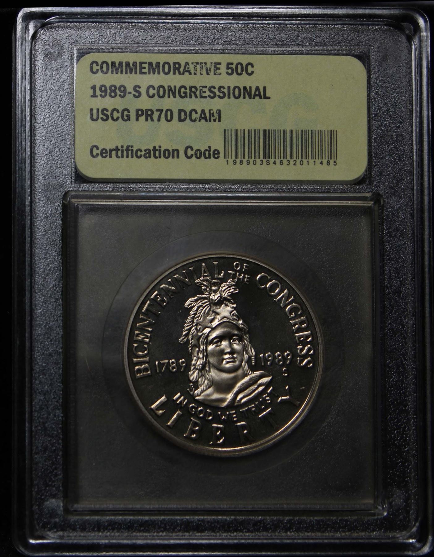 1989-S Congress . . Proof Commem Half Dollar 50c Graded GEM++ Proof Deep Cameo By USCG. The 1989 Congress Bicentennial Commemorative Half Dollar was one of three coins released to celebrate the 200th anniversary of Congress. The legislative body had first convened under the US Constitution in 1789 in Philadelphia. Certified and Graded Perfection Gem+++ Proof Deep Cameo by USCG.