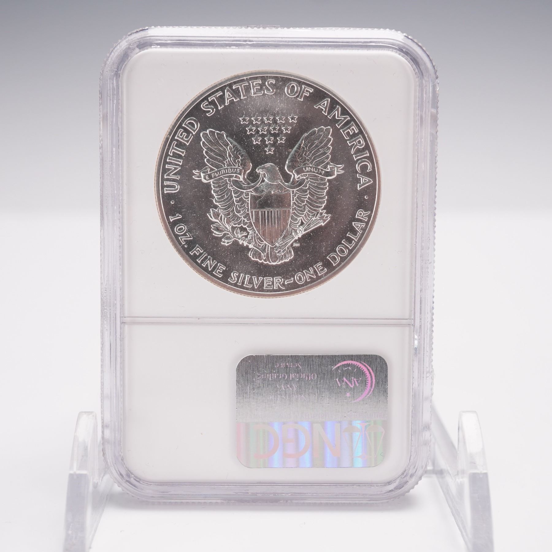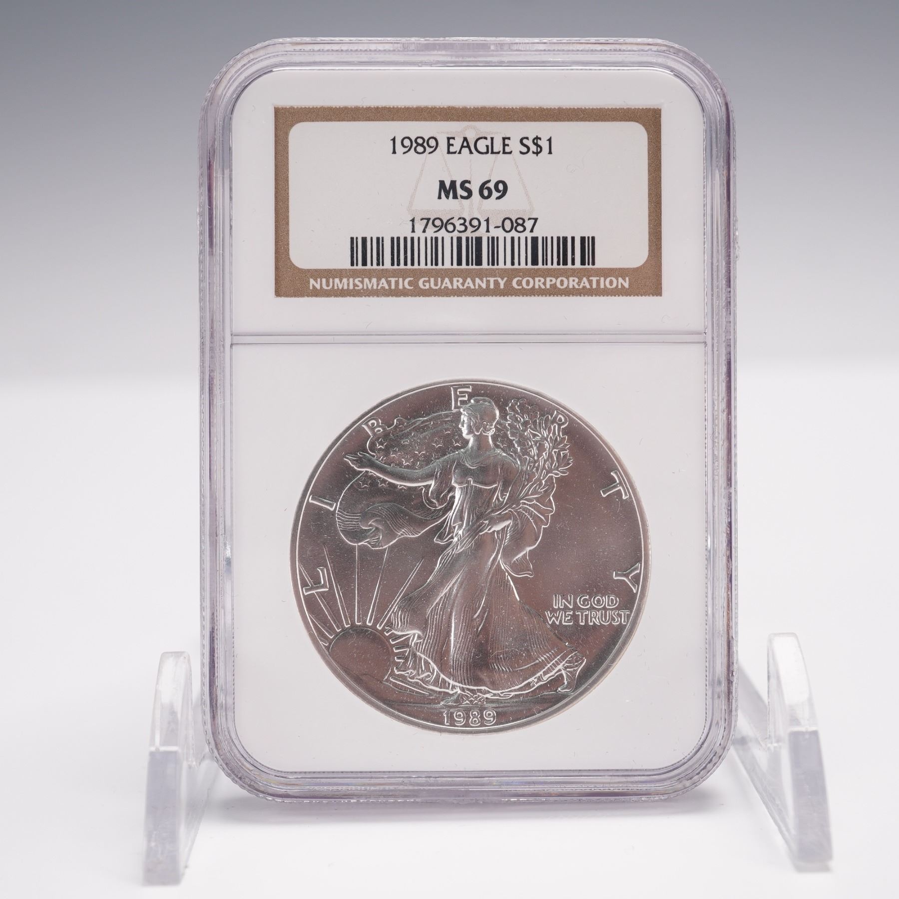 Struck in one troy ounce of .999 fine silver, this coin features the Walking Liberty design on the obverse with inscriptions LIBERTY, IN GOD WE TRUST, and the date 1989. The reverse displays a heraldic eagle with shield and inscriptions UNITED STATES OF AMERICA, 1 OZ FINE SILVER, and ONE DOLLAR. Certified and encapsulated by Numismatic Guaranty Corporation (NGC) with a grade of MS 69.