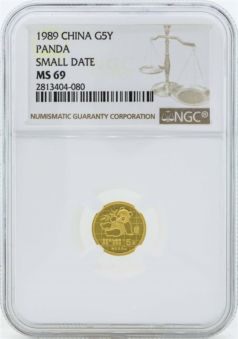 One 1989 Small Date China 5 Yuan Panda Gold Coin NGC MS69. NGC Certified.