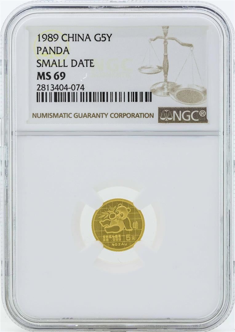 One 1989 Small Date China 5 Yuan Panda Gold Coin NGC MS69. NGC Certified.