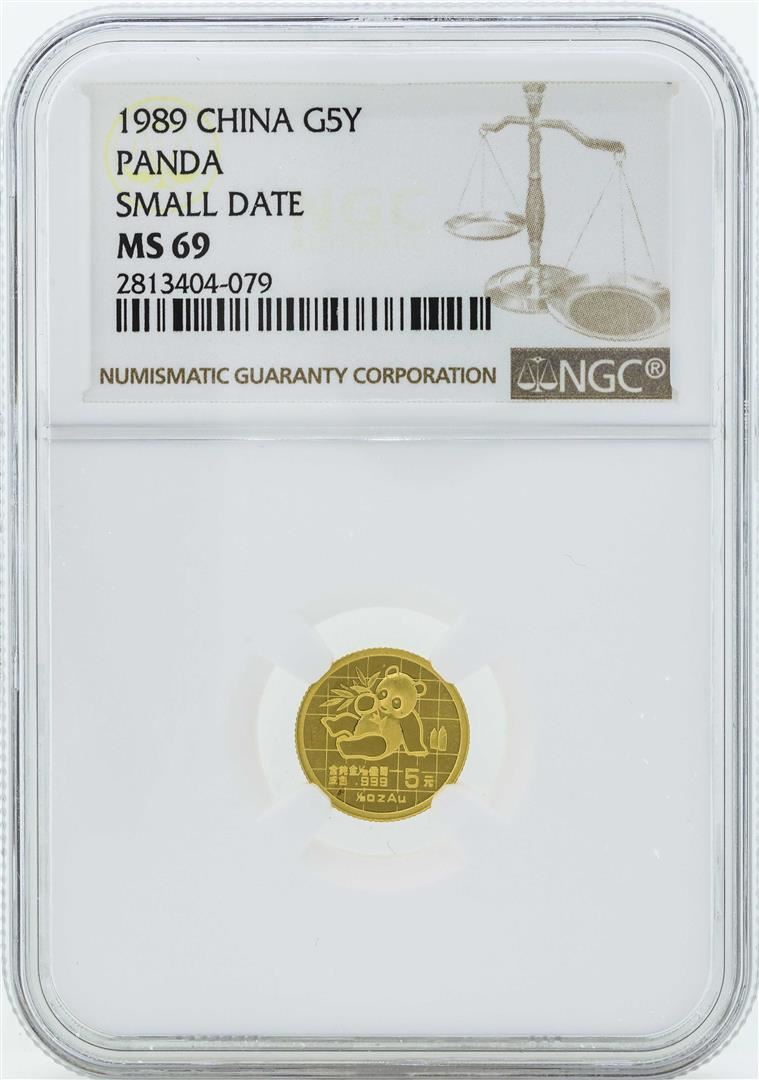 One 1989 Small Date China 5 Yuan Panda Gold Coin NGC MS69. NGC Certified.