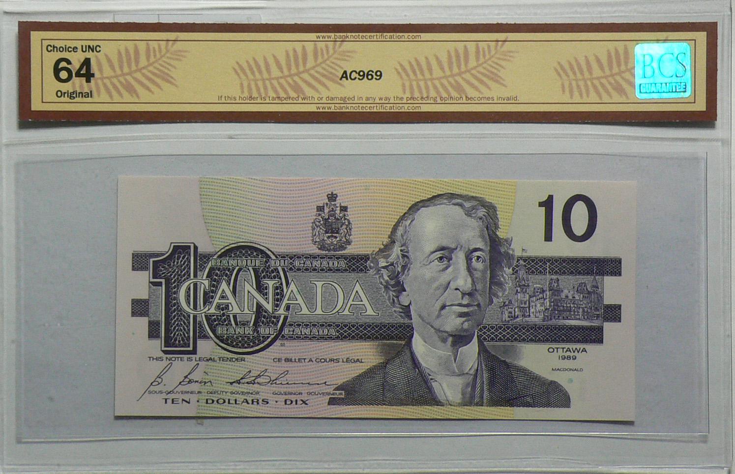 1989 Ten Dollars Replacement, BC-57bA, BCS UNC-64, Bonin Thiessen, serial ATX2242112.