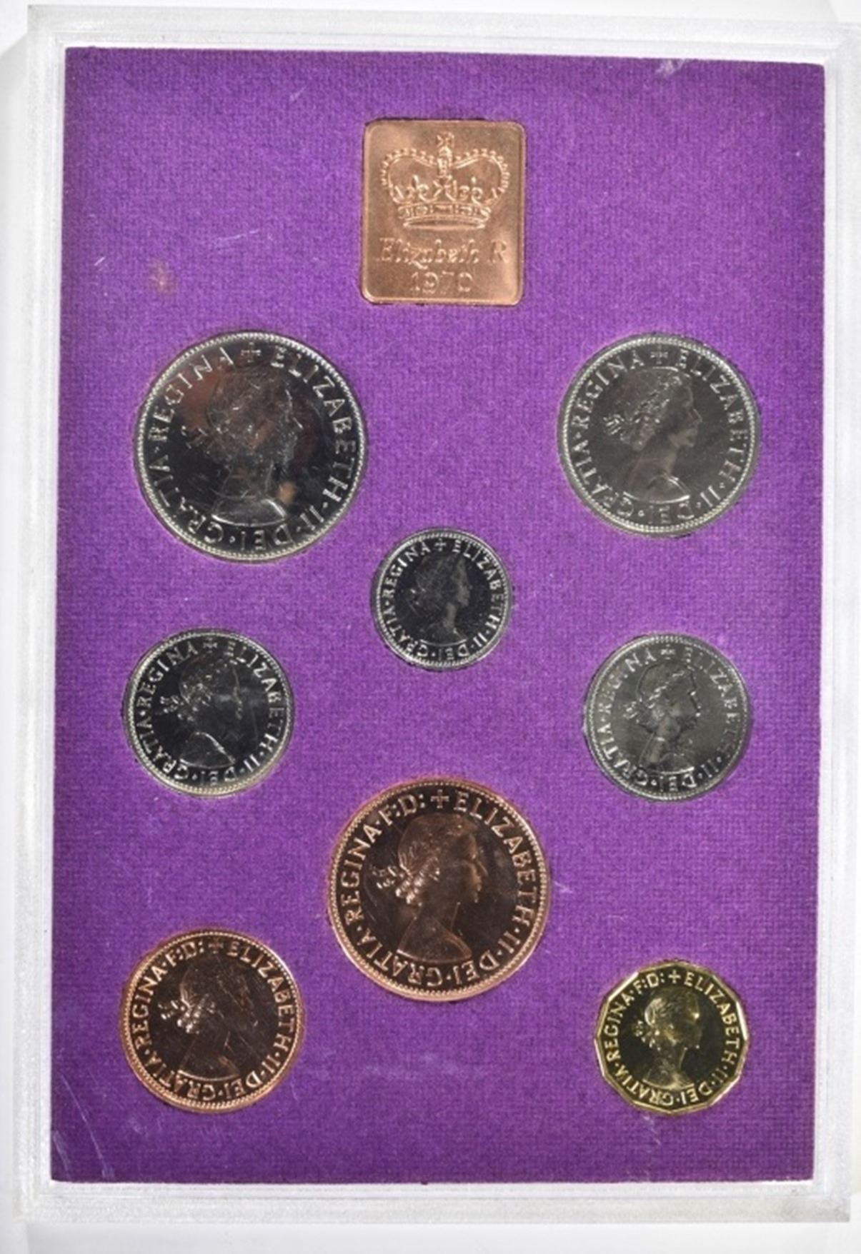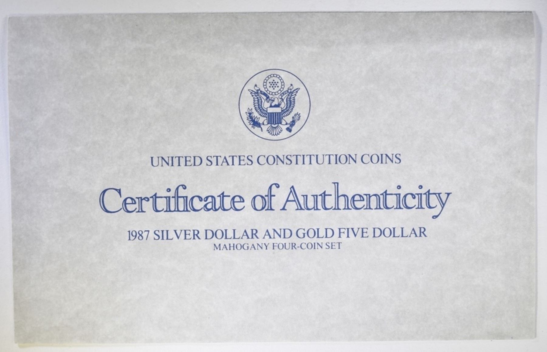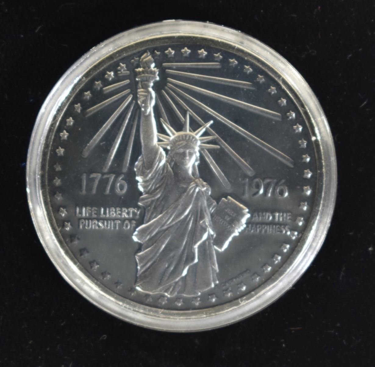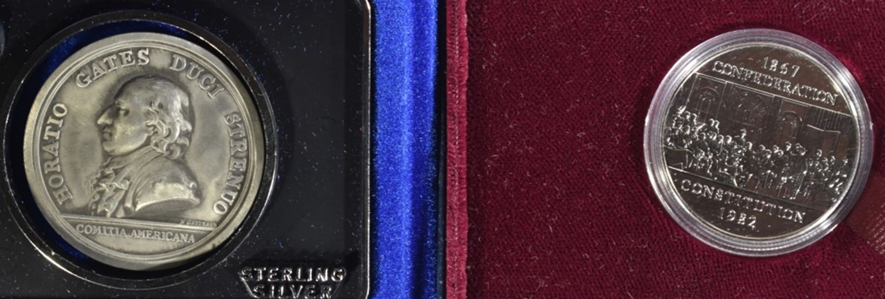 SILVER DOLLARS IN 4 PC WOOD BOX (NO GOLD PIECES); 1970 BRITISH PROOF SET; 4 CANADA DOLLARS; 1973 STERLING BICENTENNIAL MEDAL & 1976 BICENTENNIAL MEDAL ESTIMATE $75 - 95.