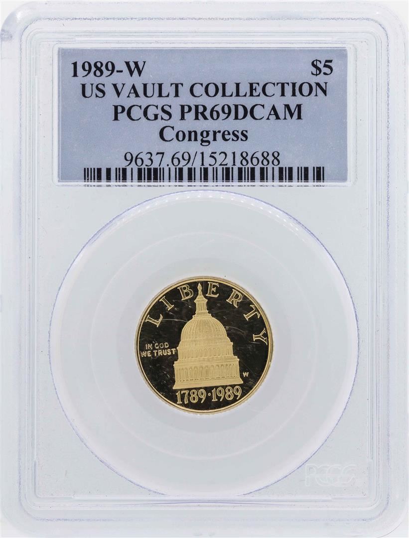 One 1989-W $5 US Vault Collection Congress Gold Coin PCGS PR69DCAM. PCGS Graded.